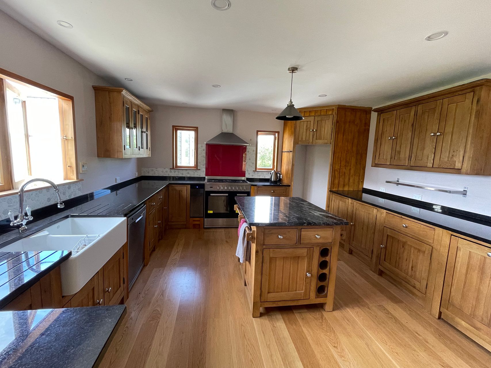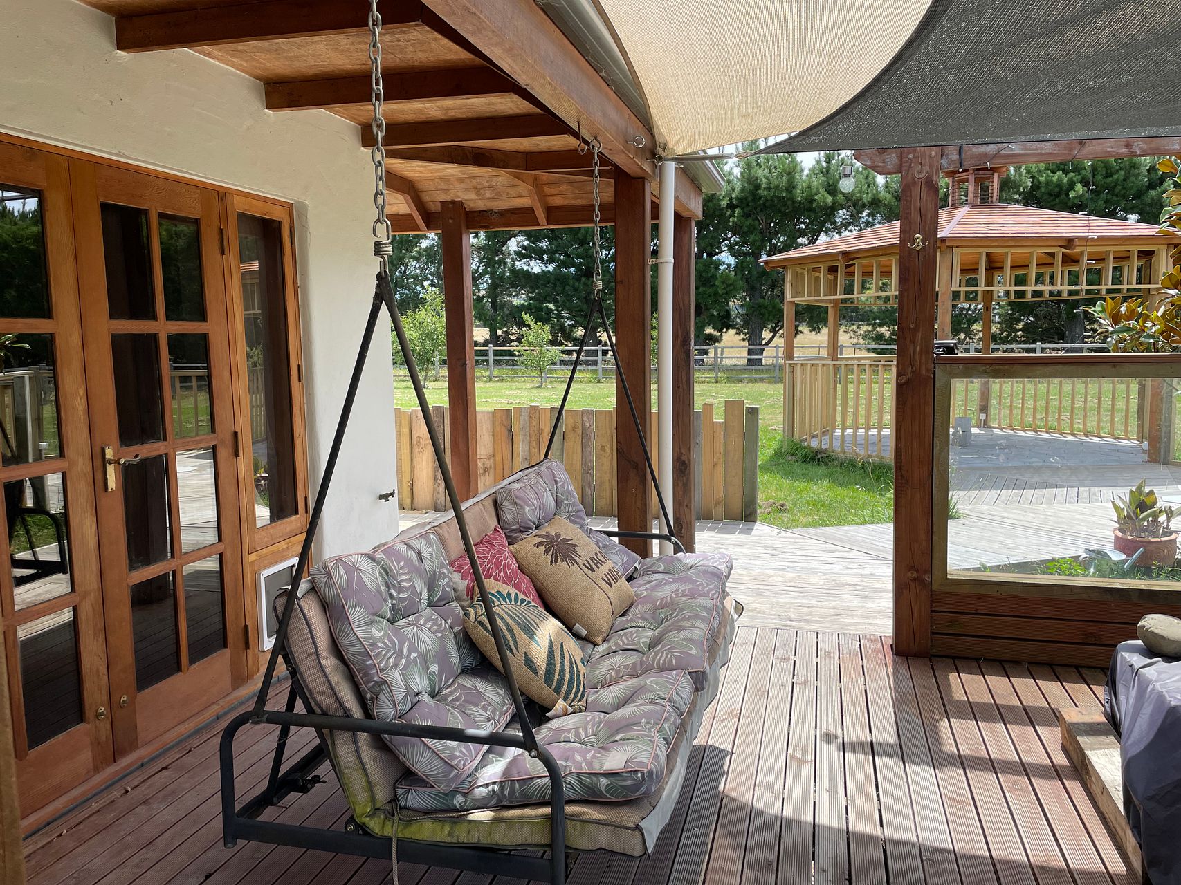 The house boasts a generous cook's kitchen with granite bench tops, a granite topped island, gas hob with electric oven and handsome ceramic double sink. Double French doors, connect the open plan living space to the decks outside, with shade sails and swing seat making perfect spot for relaxing.
