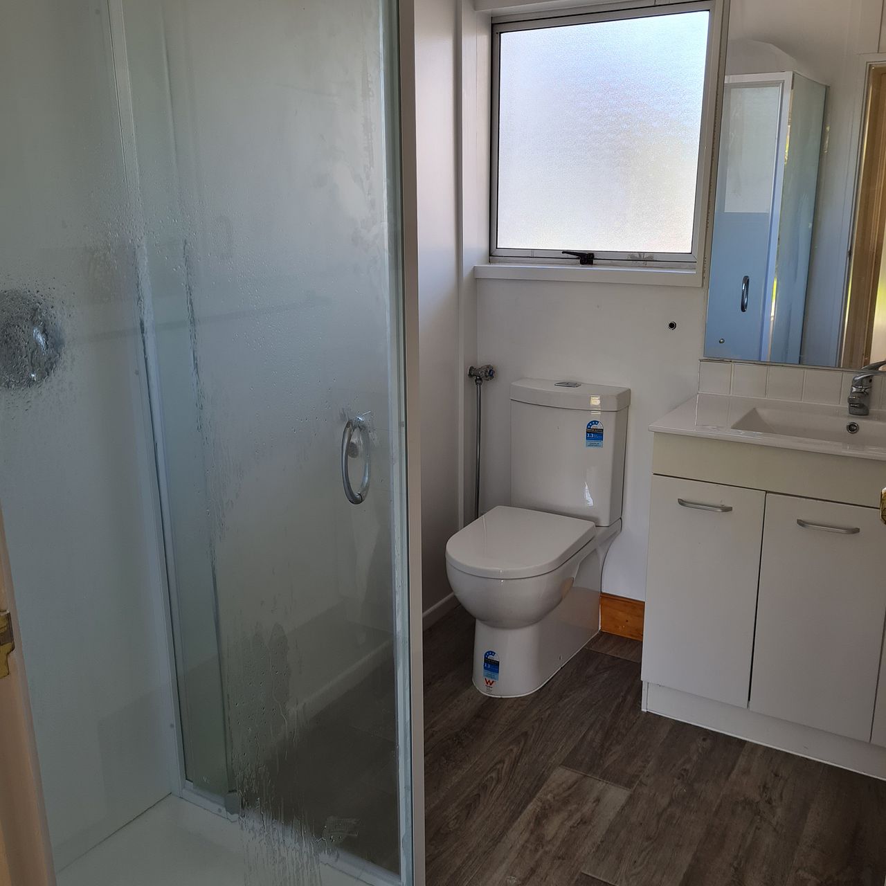 New bathroom with shower and bathroom heater.