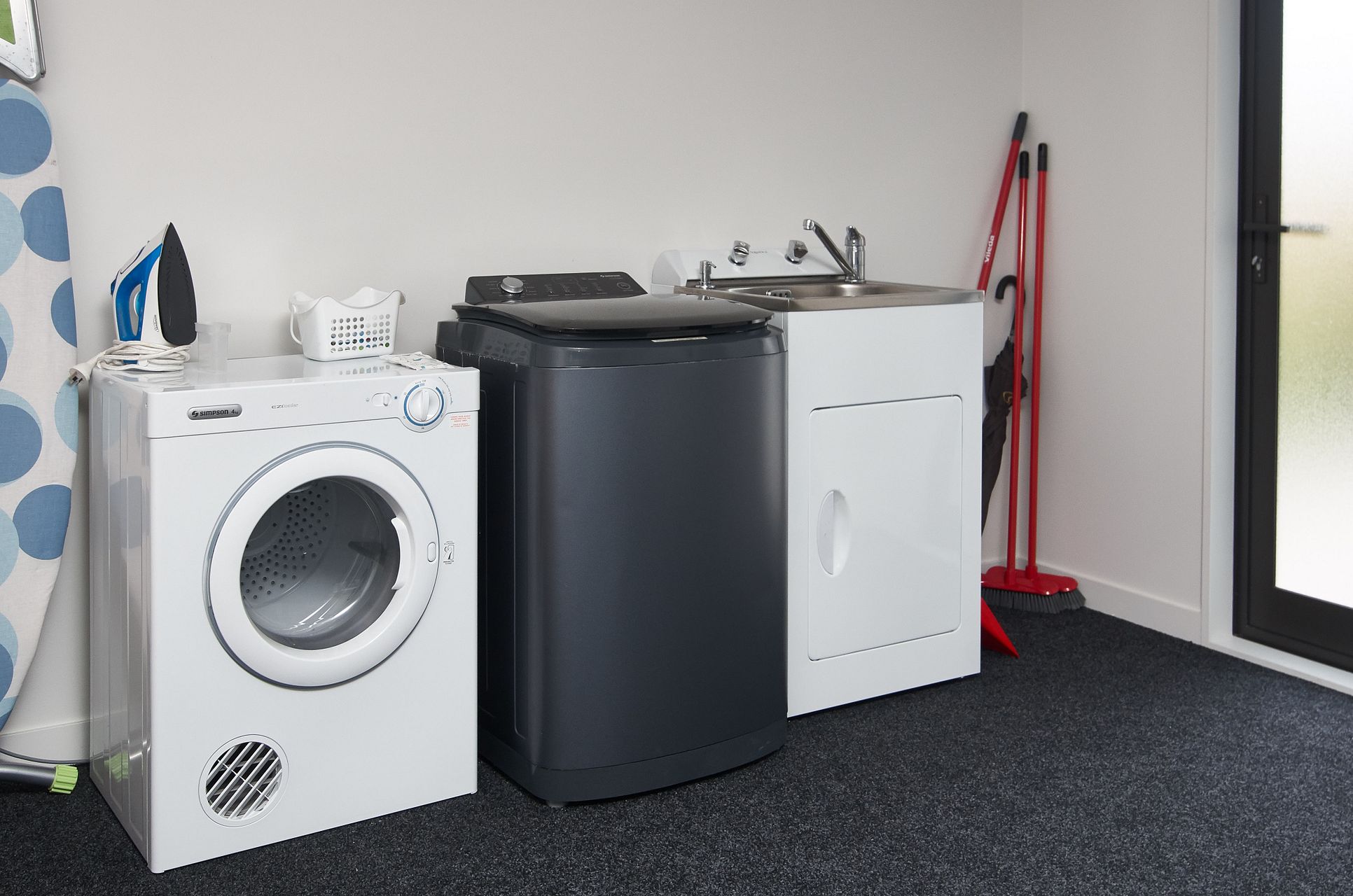 The carpeted garage includes a laundry area with washing machine, drier and laundry tub.