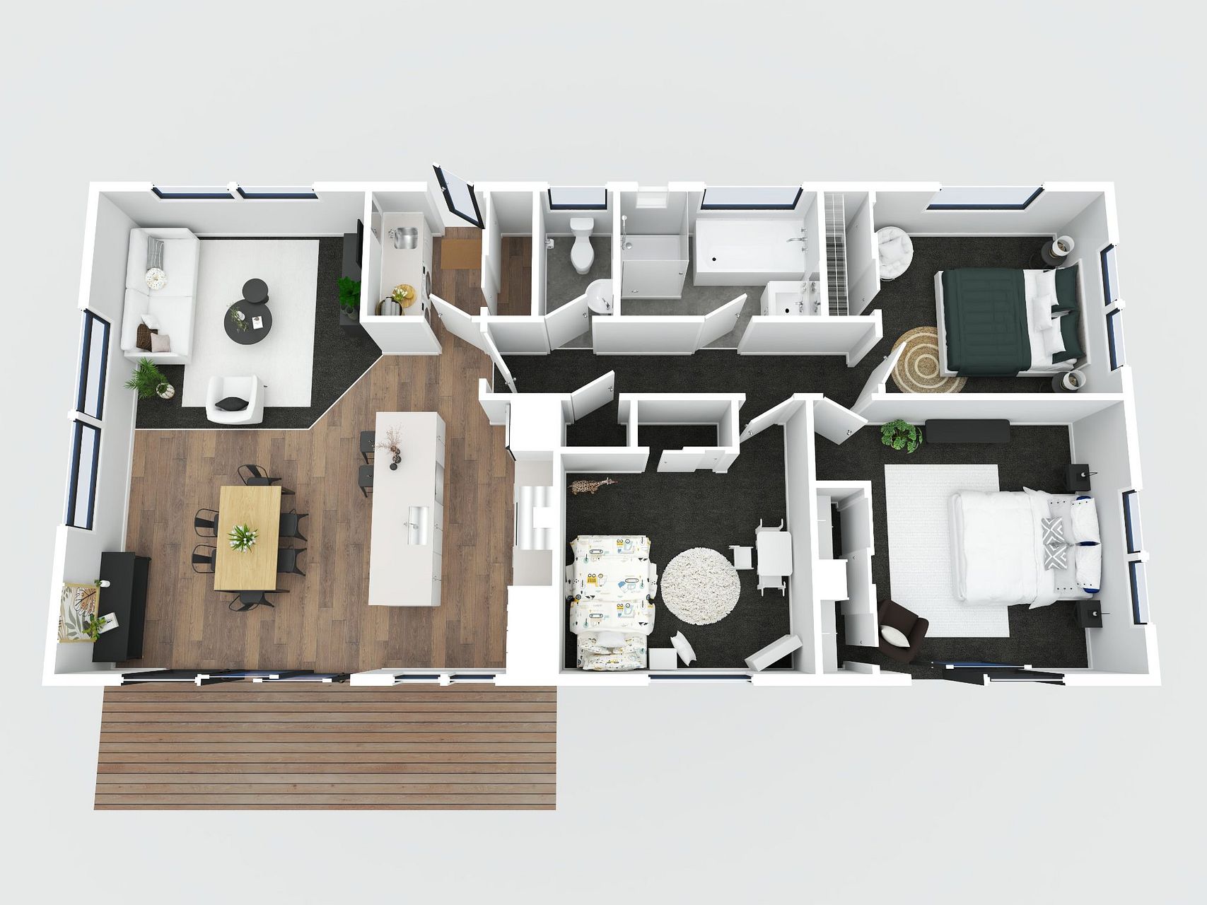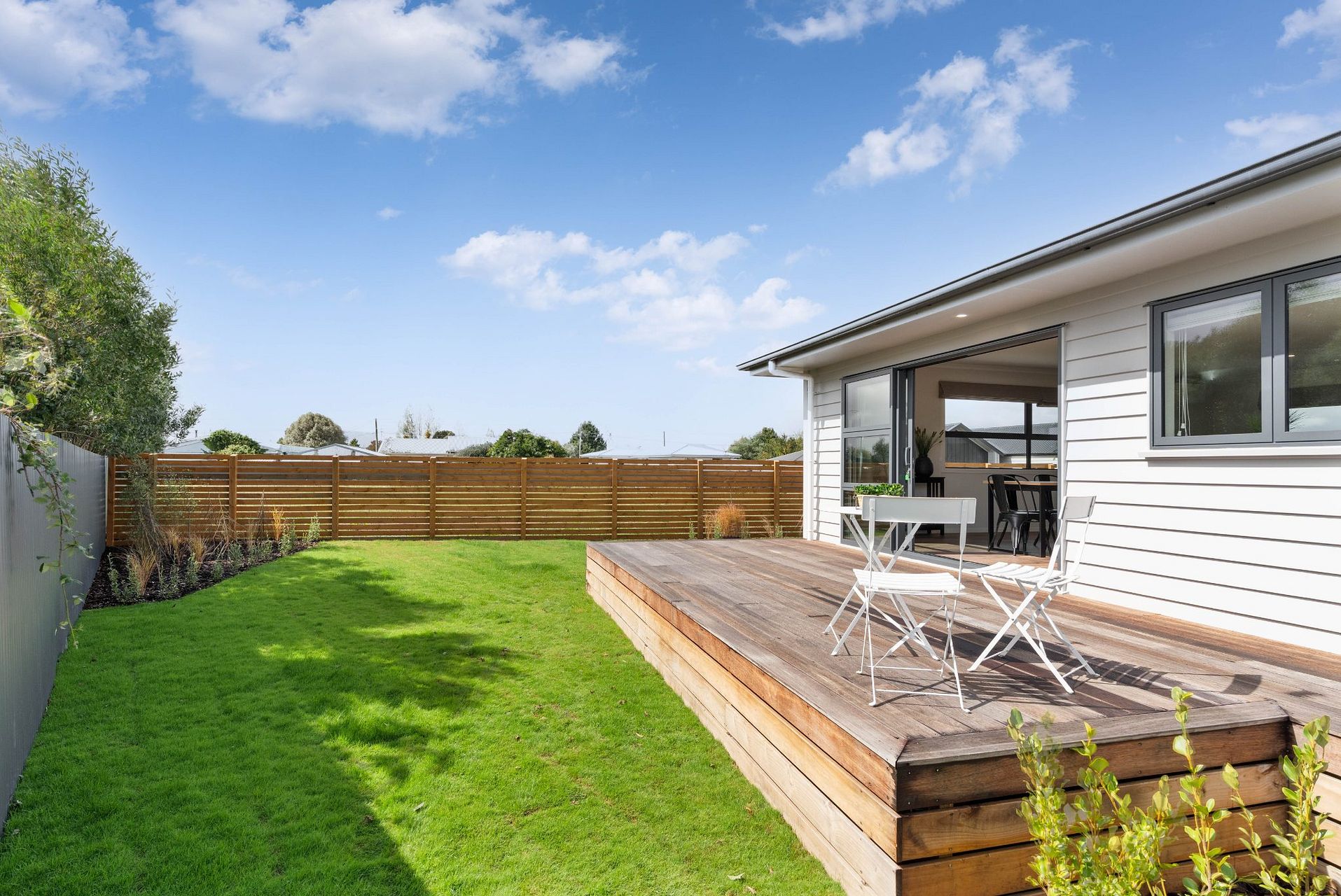 The open-plan living and dining area create a welcoming atmosphere for entertaining guests or enjoying family time. Step outside onto the deck and you'll find yourself in a tranquil garden setting, perfect for weekend barbecues or simply soaking up the sun. The property comes with three parking spots, removing any concerns about vehicle storage.