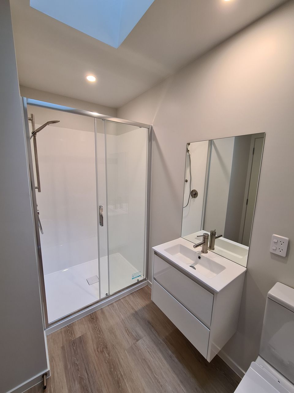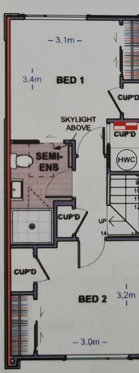 The two spacious bedrooms upstairs both have large built-in wardrobes with hanging rails. Both rooms are able to fit a queen-sized bed. The bathroom is also spacious with a skylight for natural light.
