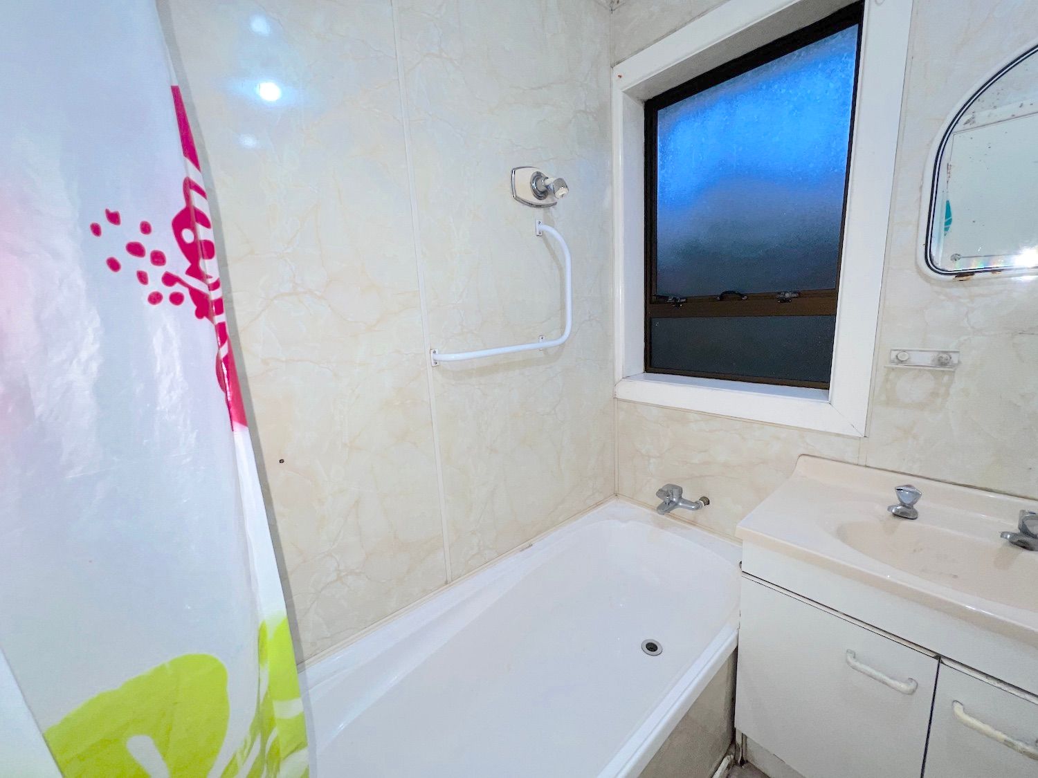 The bathroom has shower over bath, the toilet is separate.