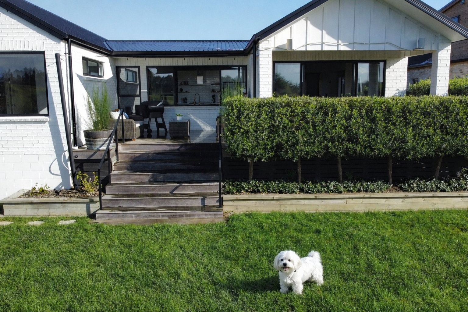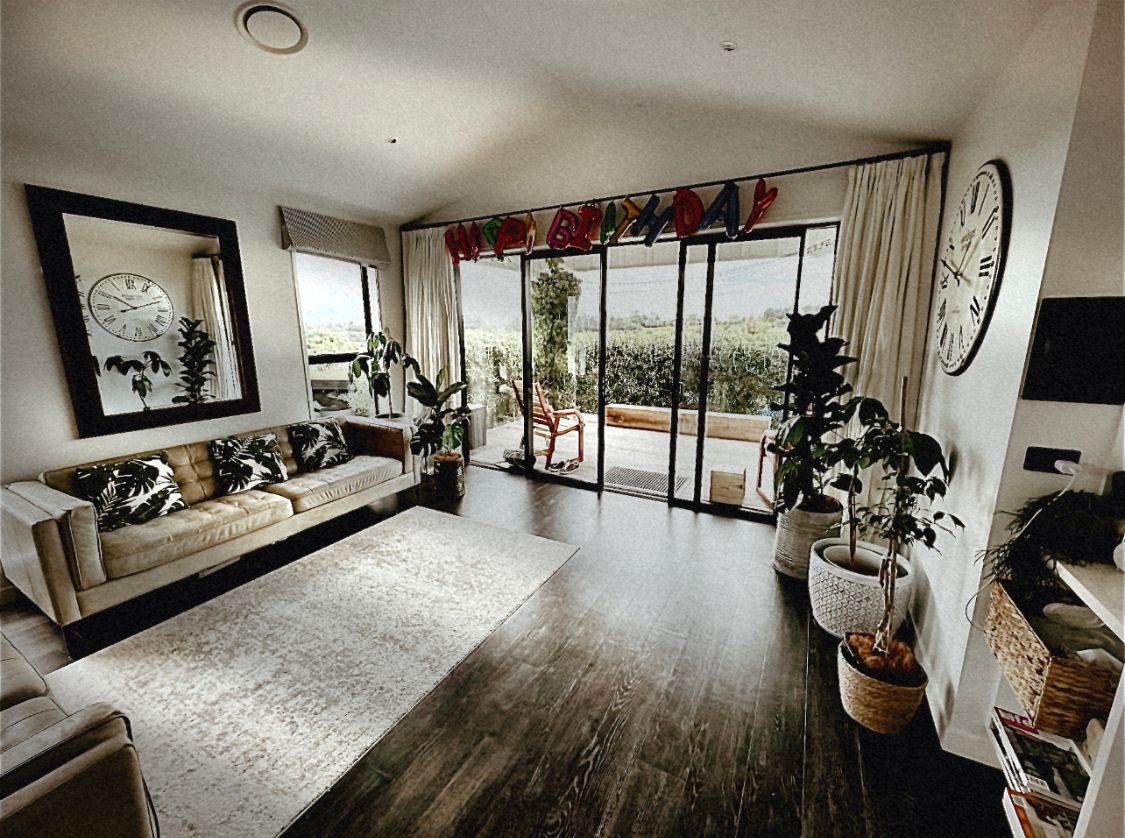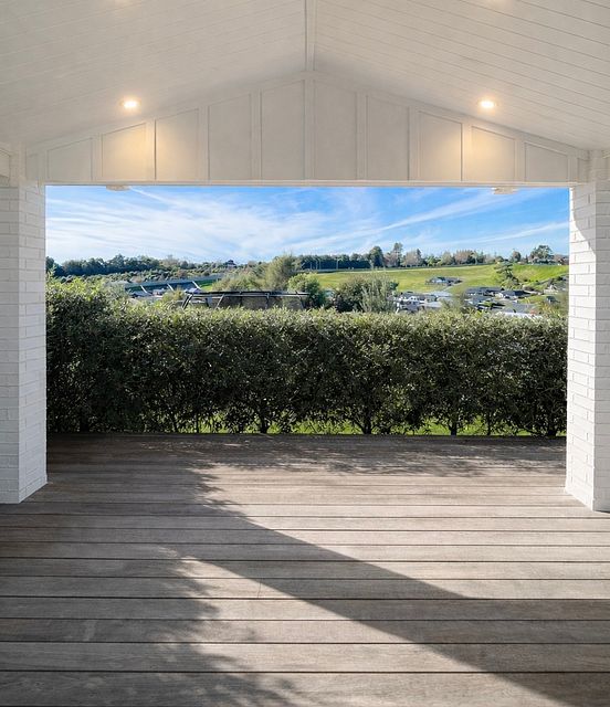 Outdoor Living: A large covered deck with outdoor furniture provides the perfect place to relax and entertain, with lush grass for play and stunning views of rolling hills, lakes, and native bush.