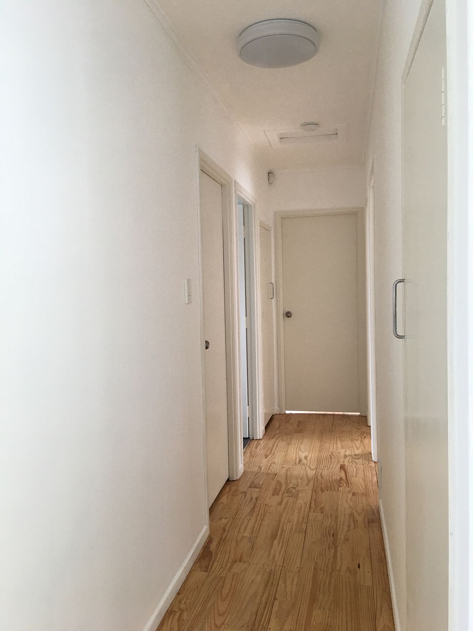 The layout offers three double bedrooms, open-plan living/dining/kitchen, a bathroom, separate toilet and laundry room. All bedrooms have built-in wardrobes. Two wall cupboards in the hallway and extra cupboards in the laundry room provide lots of good storage. A garden shed in the back yard is provided.