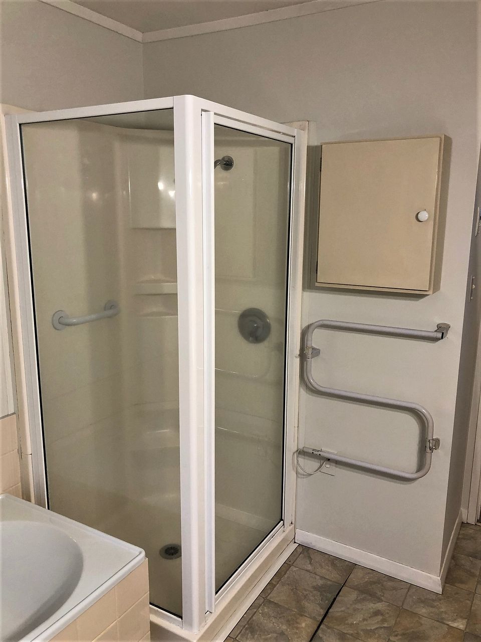 Has large bathroom with Vanity, Bath & separate shower box.