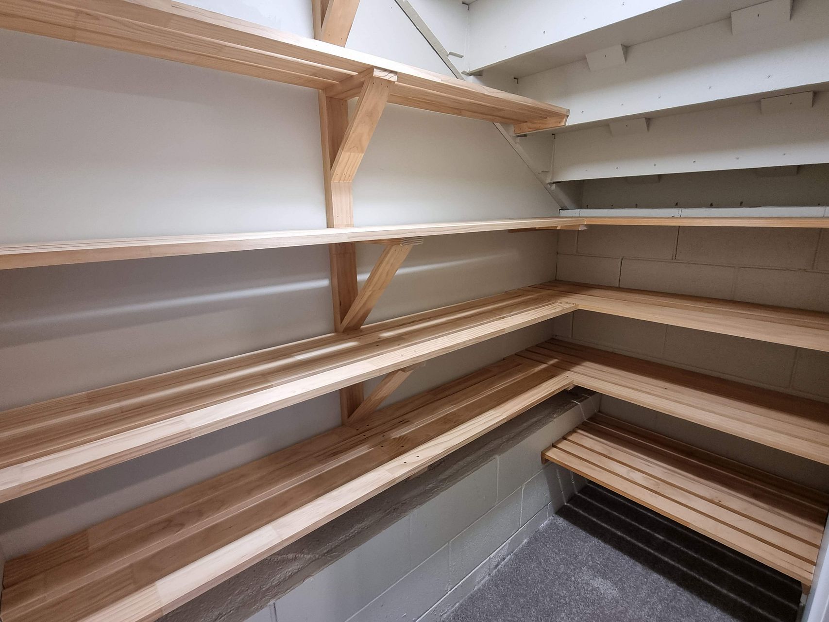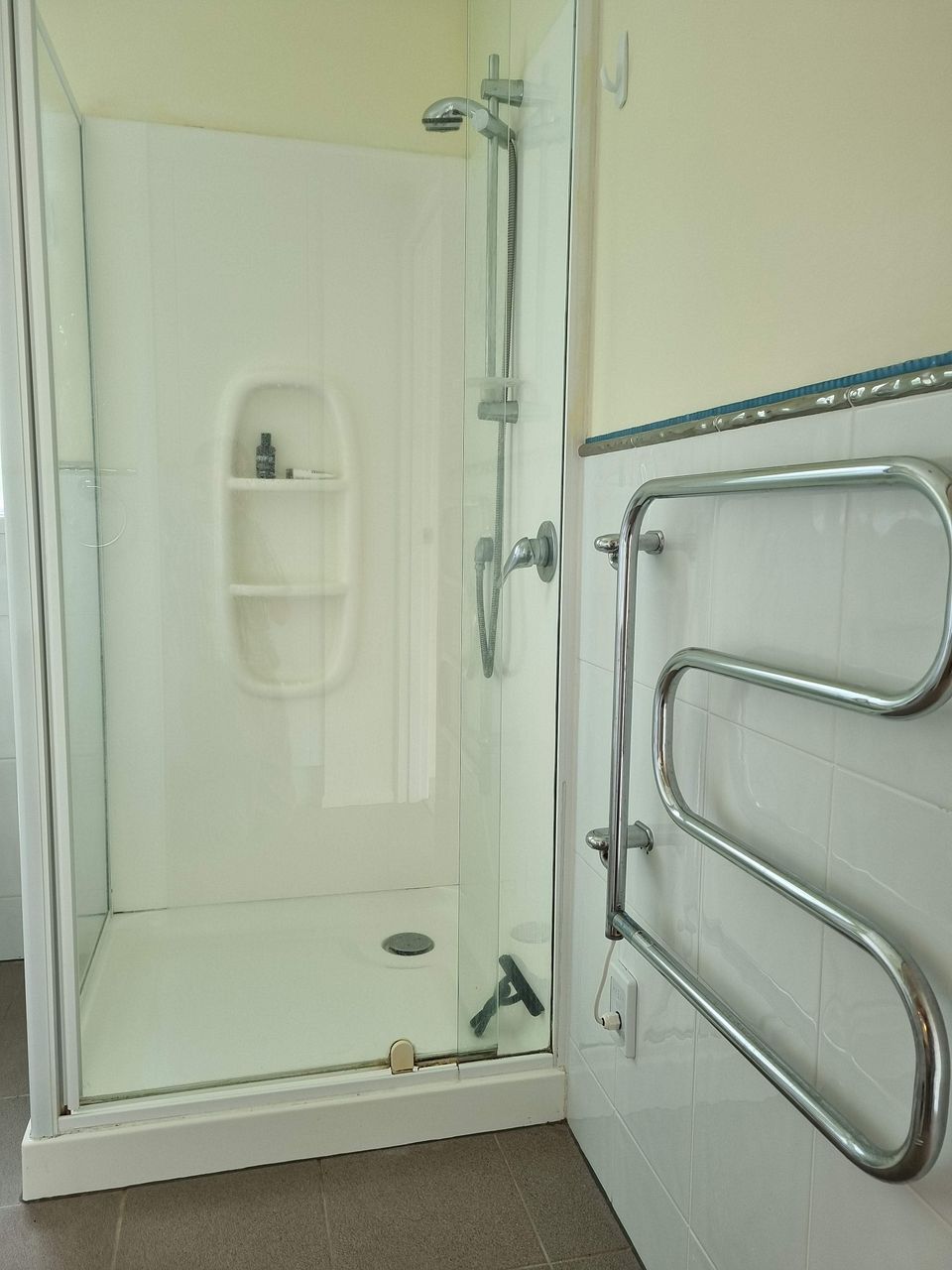 Kitchen equipment includes a dishwasher, washing machine / tumble dryer, multifunction bench-top oven / air fryer, glass-top induction hob, and an extractor fan. The bathroom has a space-heater, extractor fan, and a programmable heated towel rail.