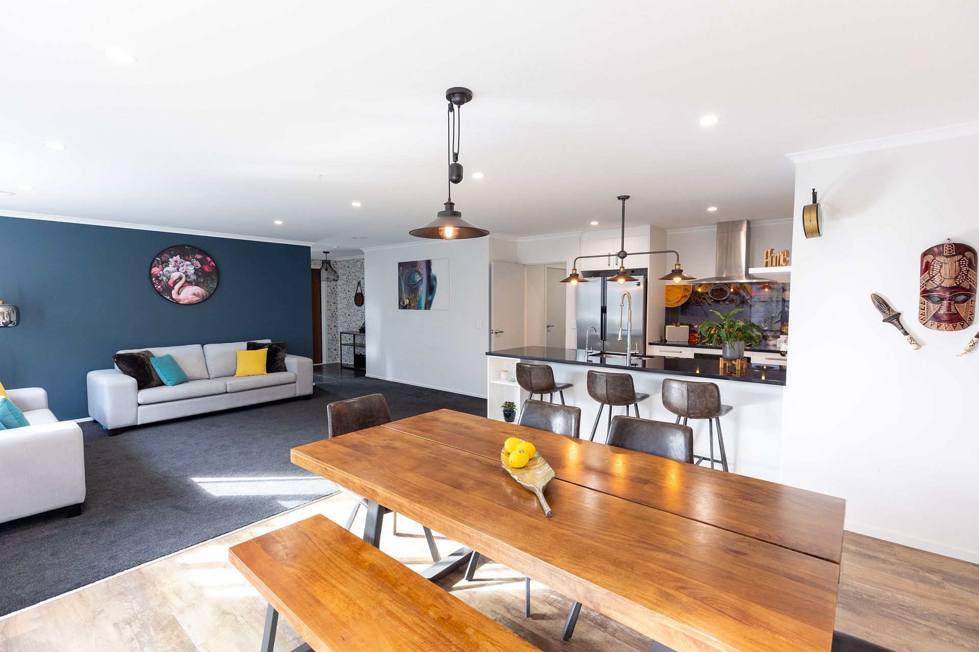 The spacious open plan living flows effortlessly out to the easy care grounds – ideal for entertaining during the warm summer months. The modern designer kitchen feature quality appliances, scullery and an island bench.