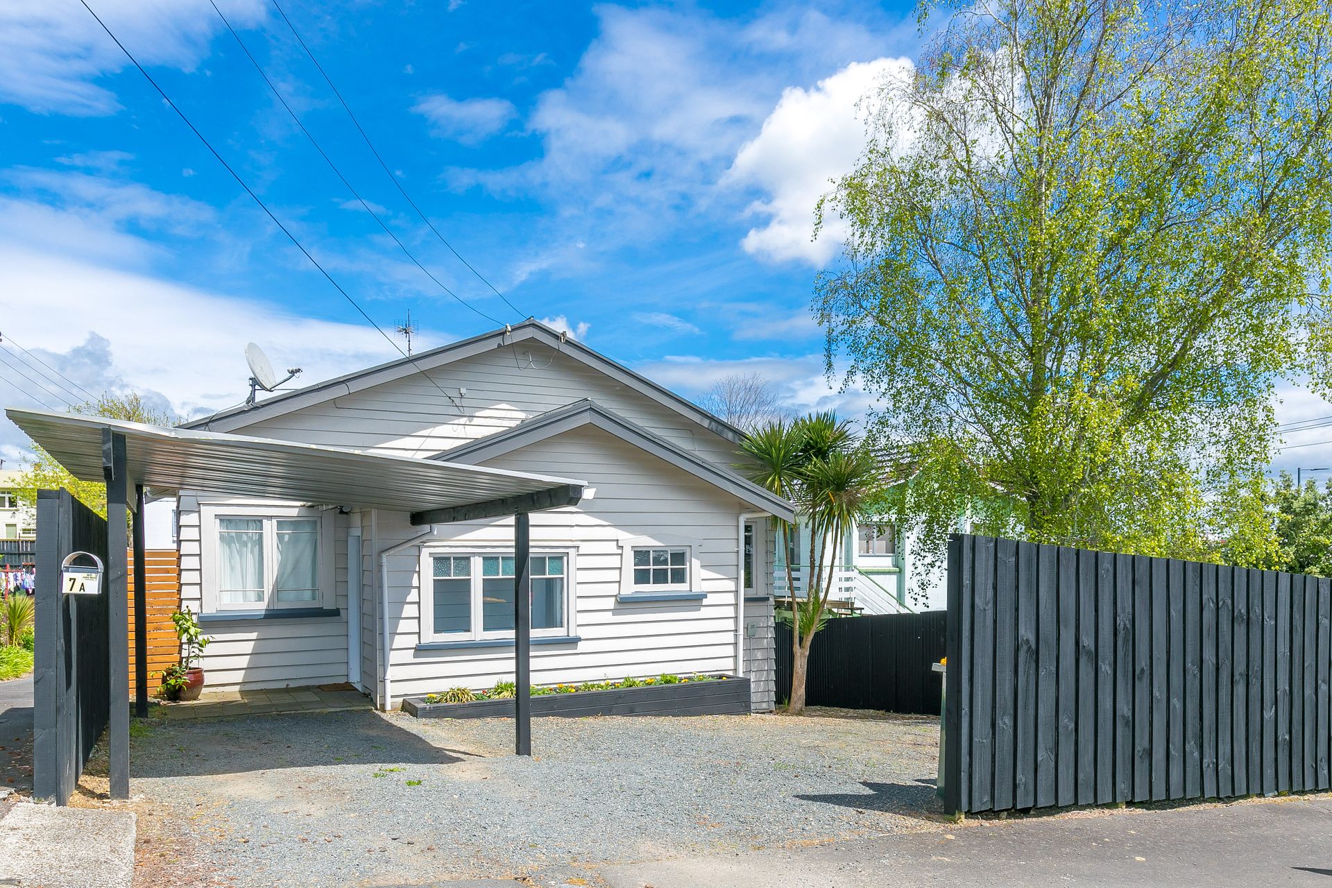 - The front yard has a single carport and enough uncovered space to fit two cars.