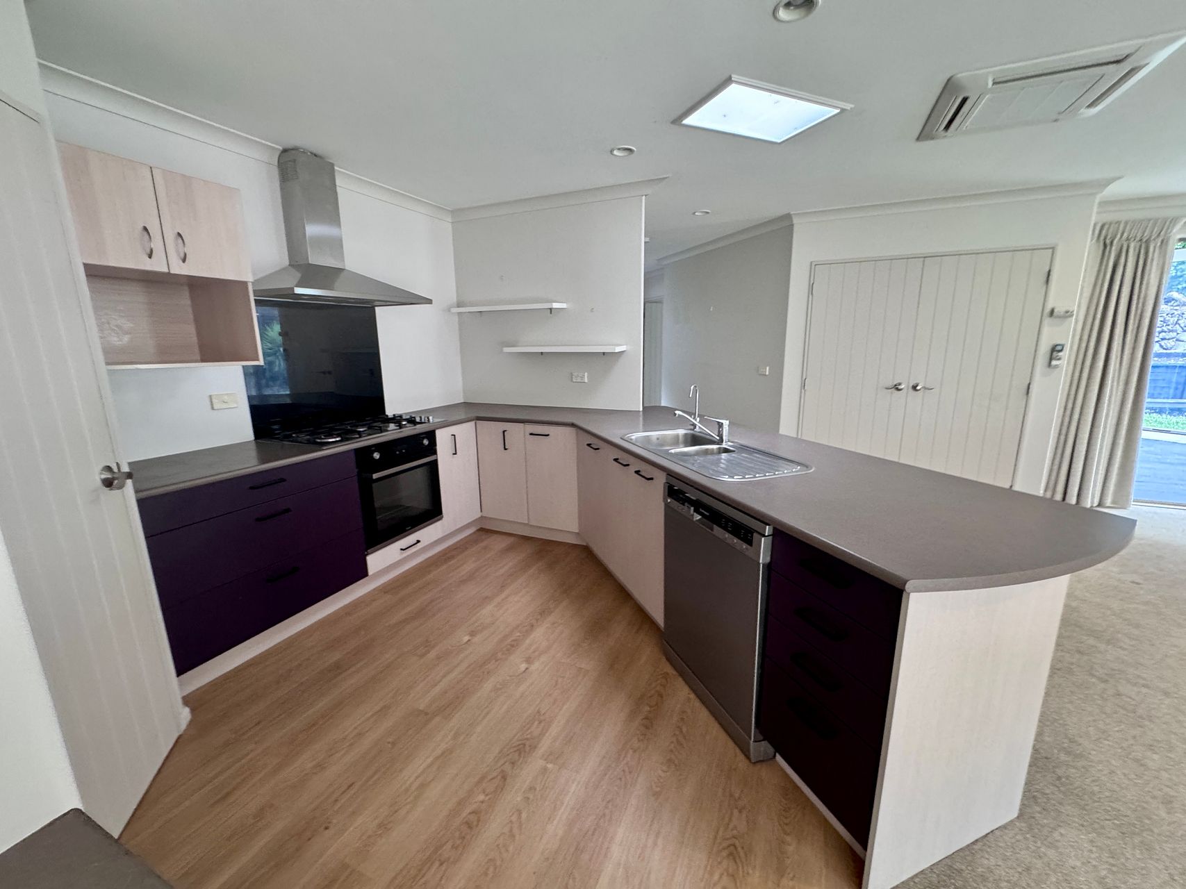 Spacious lounge with an open planned kitchen and dining . Modern kitchen is equipped with dishwasher, oven cooktop and rangehood .