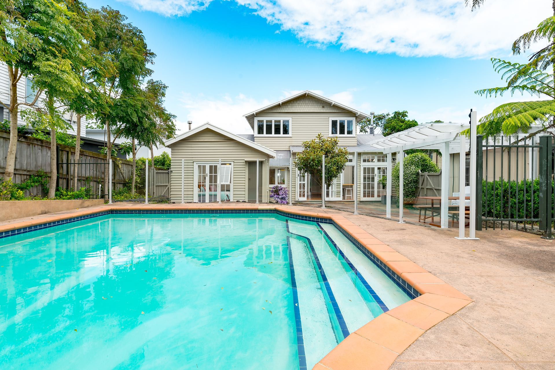 The outdoor area which flows beyond the French doors from the open plan kitchen and dining is certainly generous, with loads of room for outdoor entertaining or just chilling in sunshine with one eye on the kids whilst they enjoy the pool.