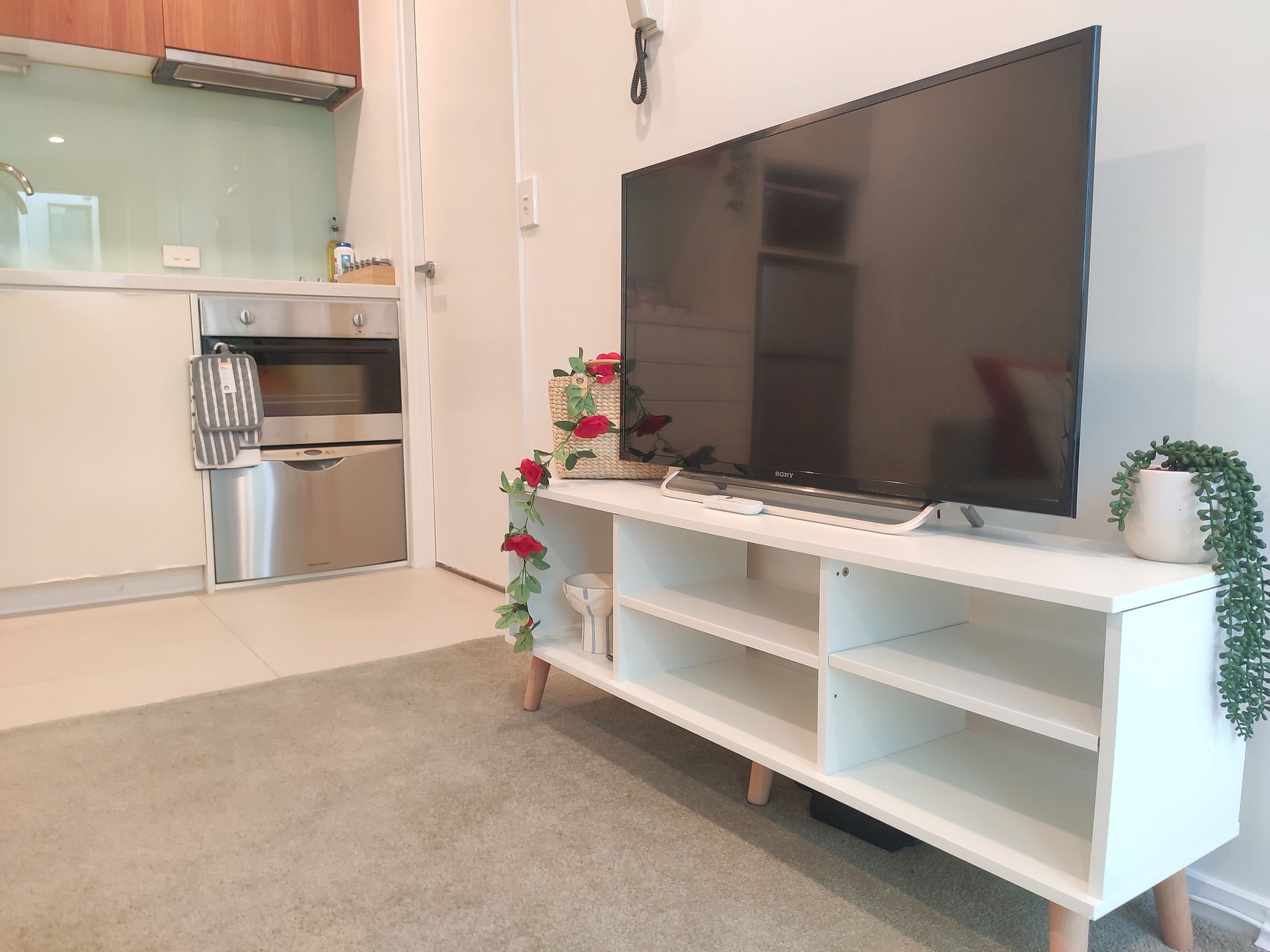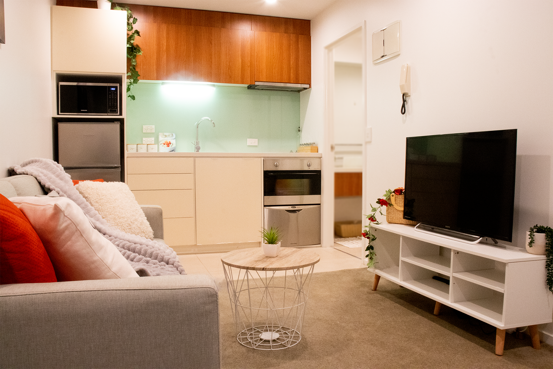 The living room is chickly furnished with a large sofa - which can be converted to a bed. An entertainment unit complete with a 40 inch TV powered by Chromecast and remote will satiate all your entertainment needs.