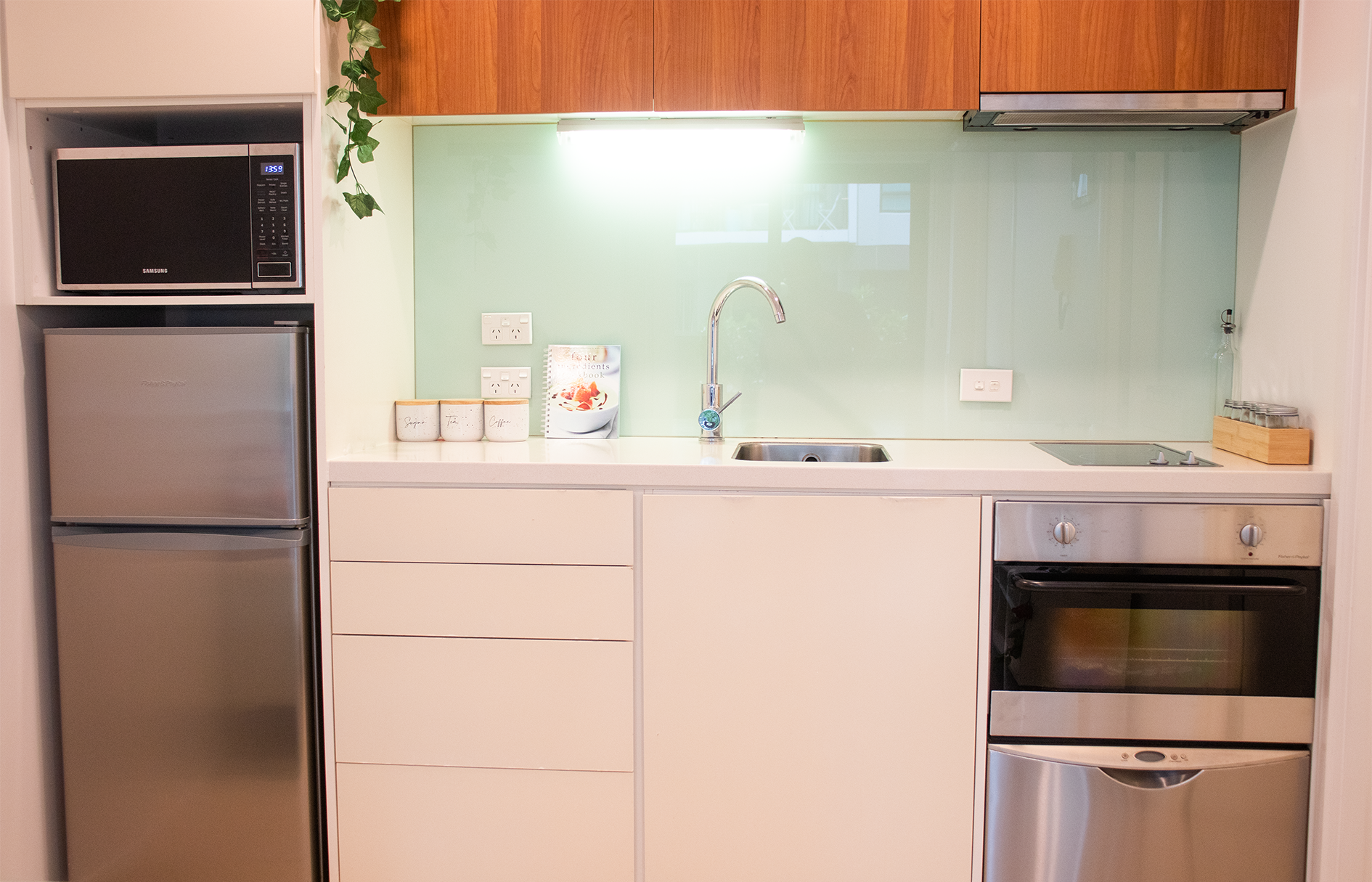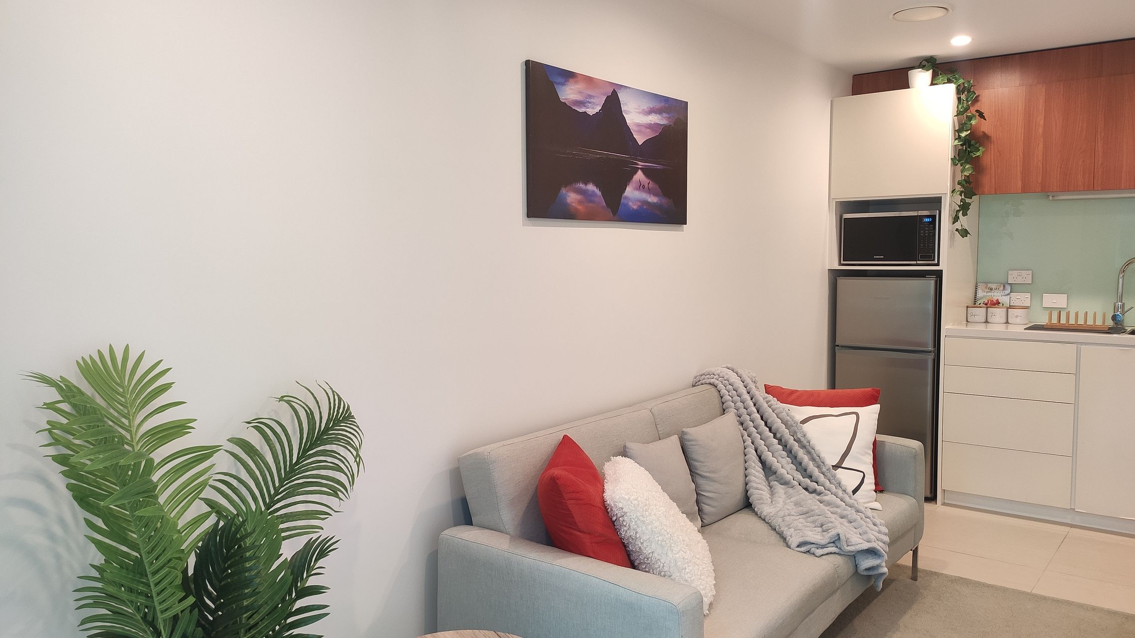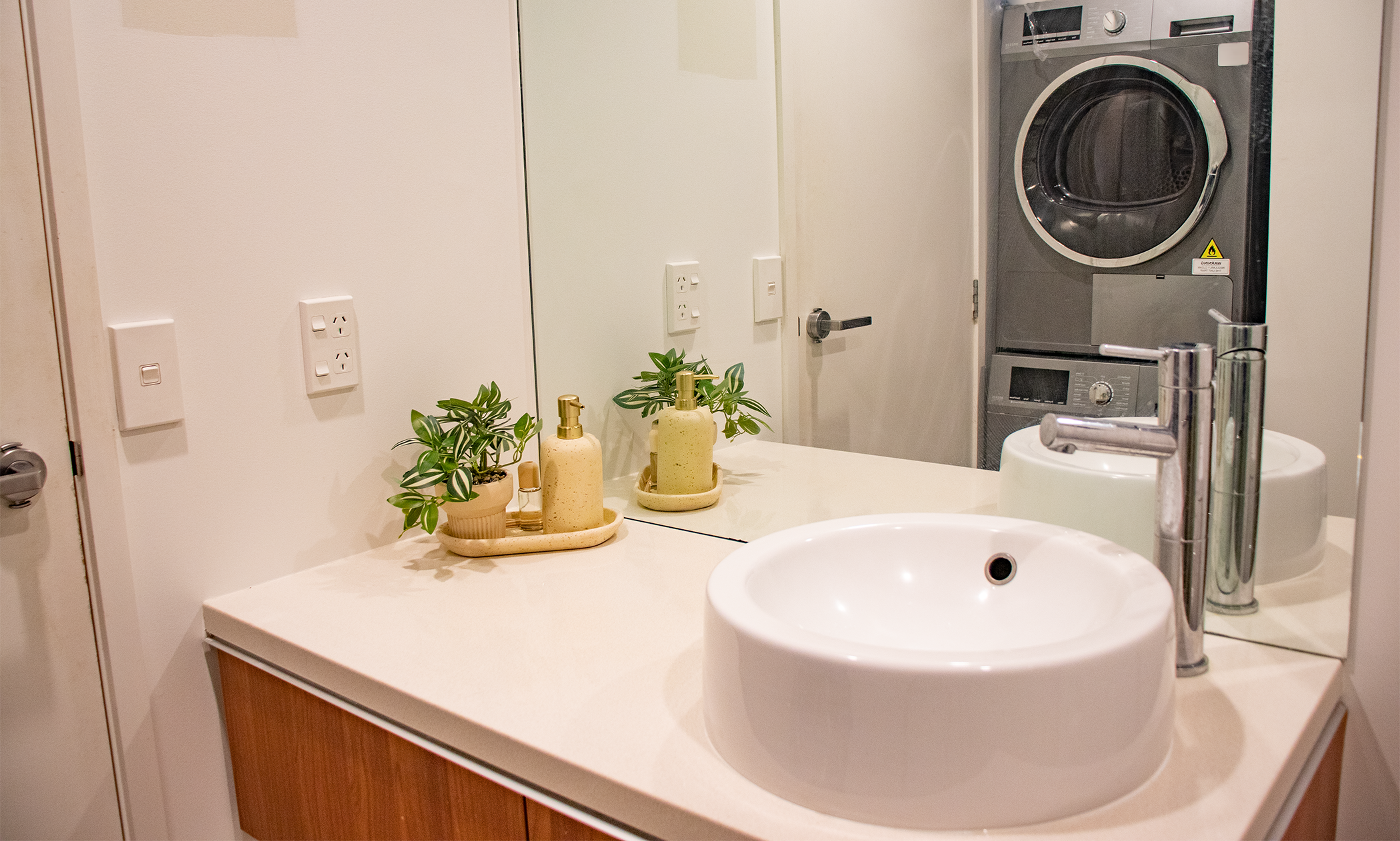 Located on Level 1, the unit also features a fully equipped kitchen with rangehood, oven, fridge, microwave, and dishwasher, along with a washing machine and dryer tucked away in the main bathroom.
