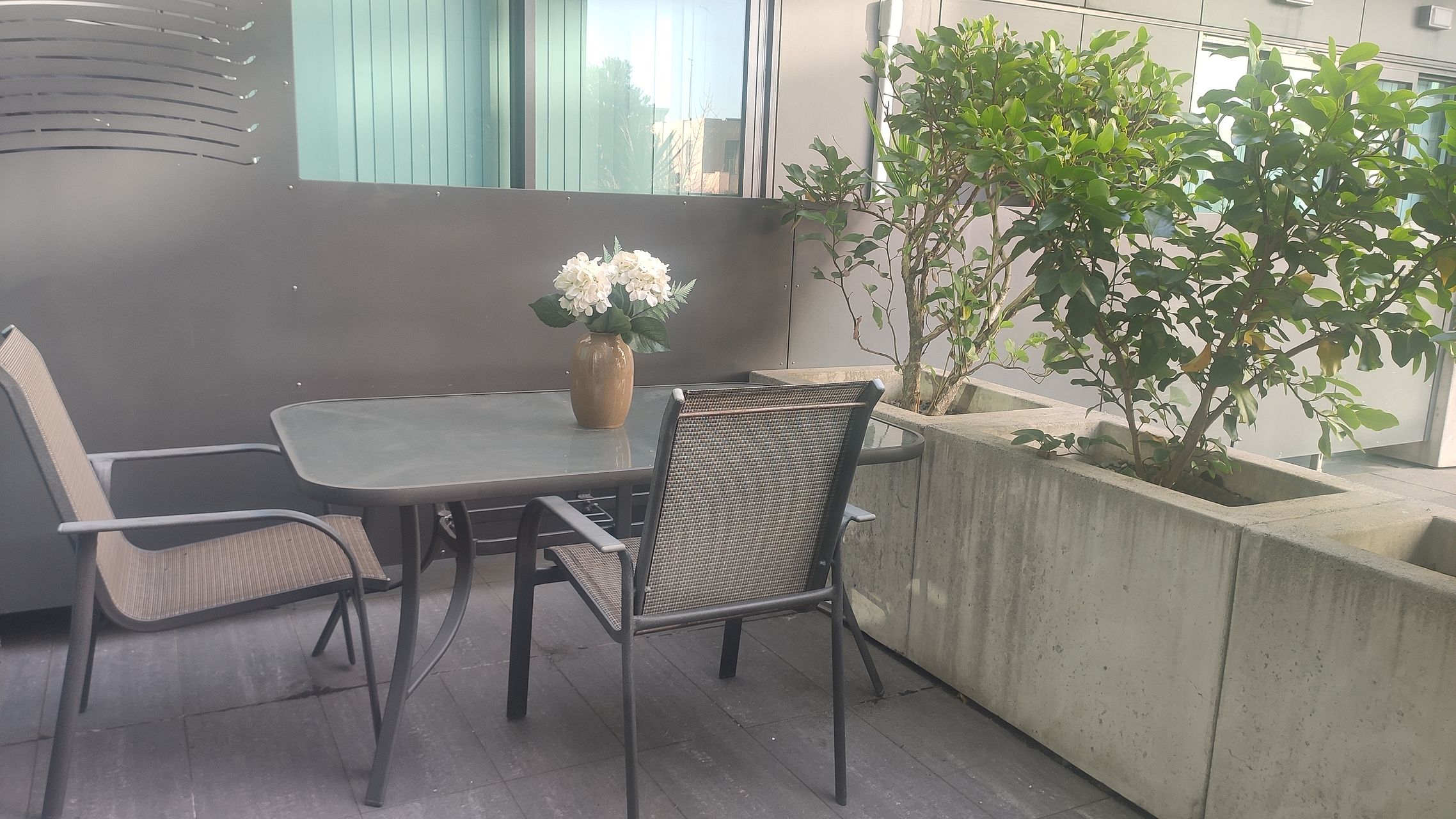 Step outside to your own private patio and immerse yourself in a tranquil retreat. A large outdoor table with chairs awaits you to enjoy a sunny day or a romantic dinner. Step further out into the central retreat area to relax and enjoy the refreshing sea breeze in the courtyard.