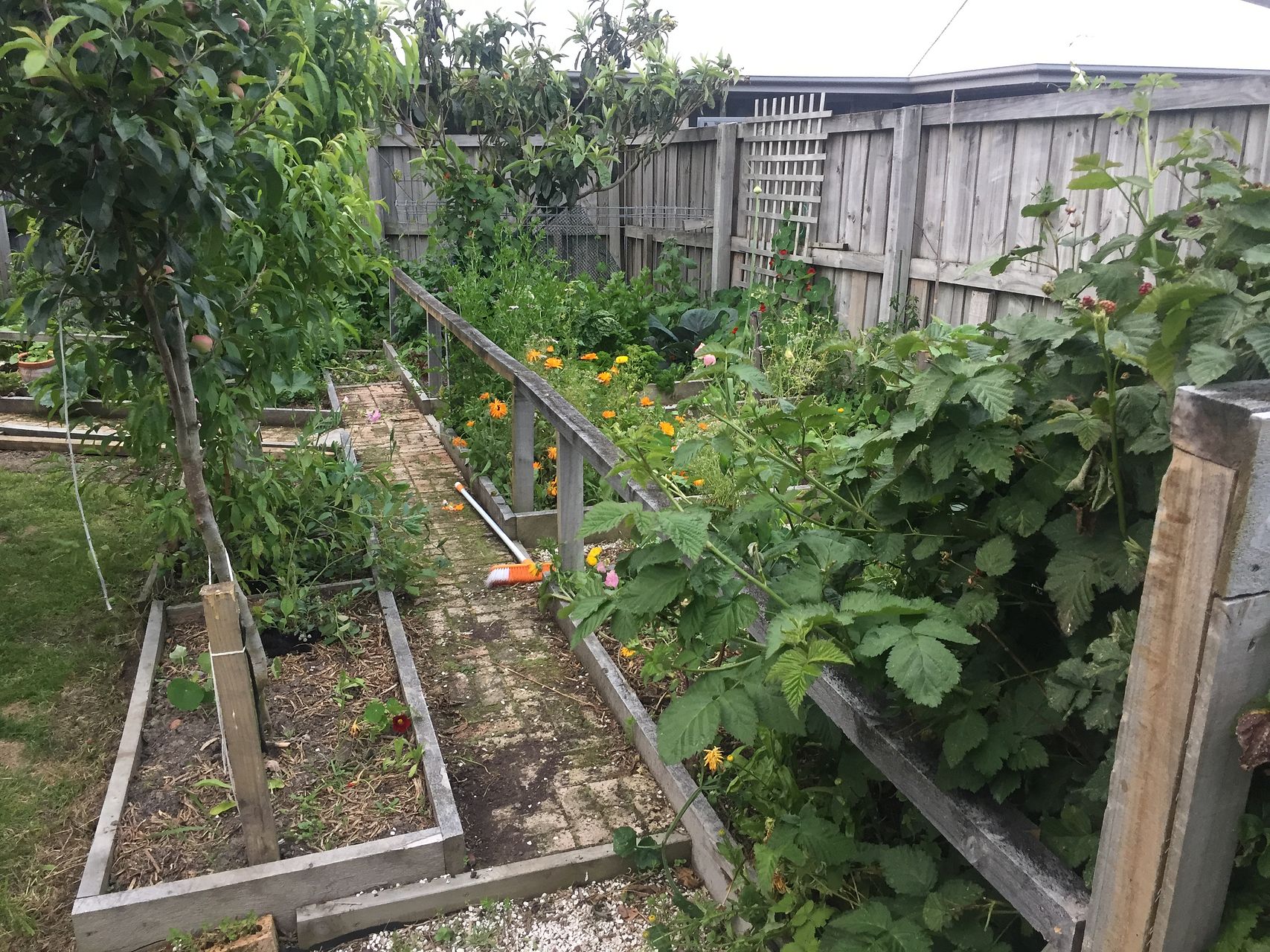 Large garden with multiple fruit trees and veggie garden and shed.