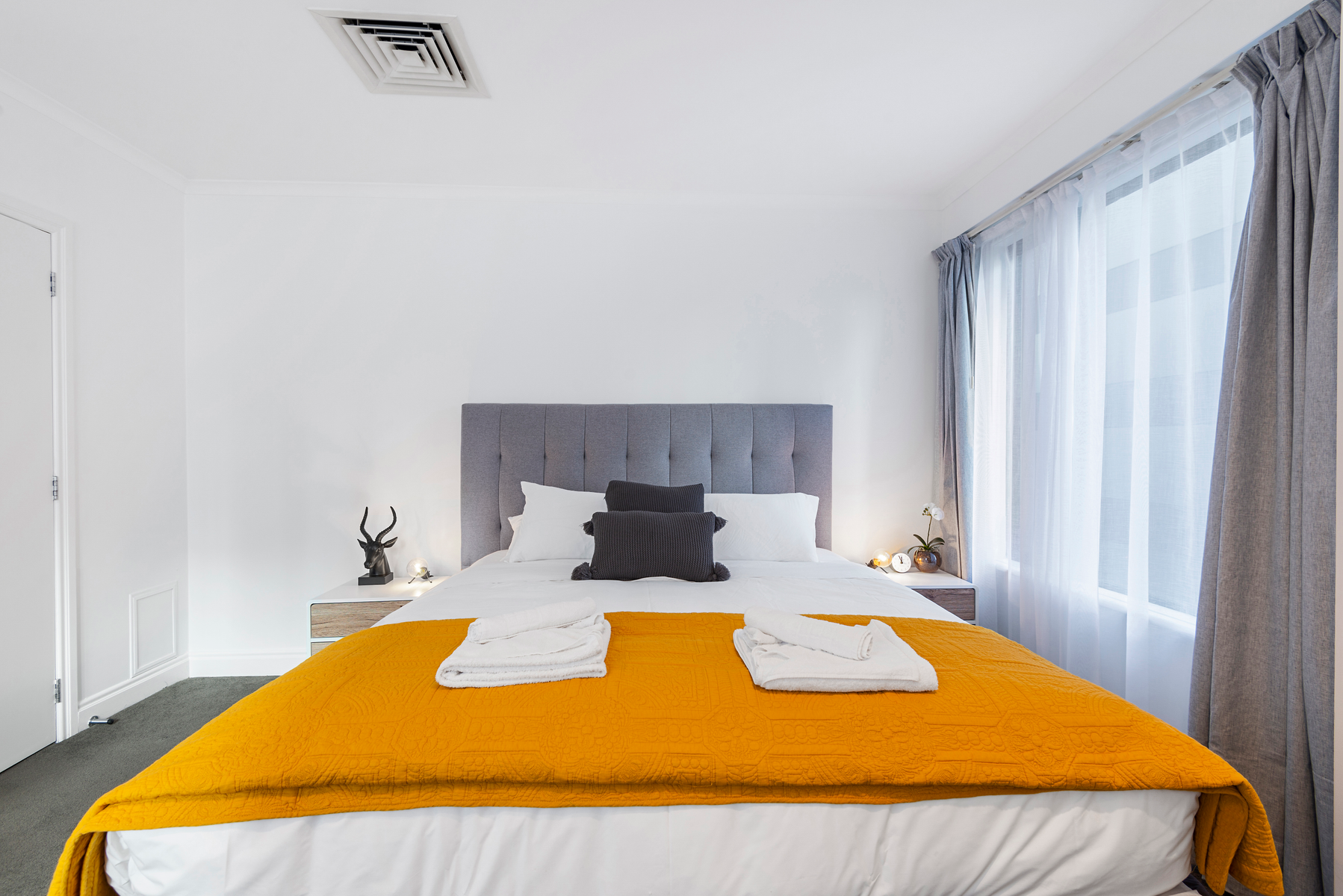 The bedroom is equipped with a spacious Super King bed, electronic safe, and a wardrobe.