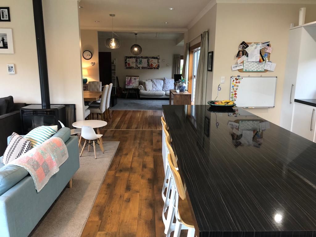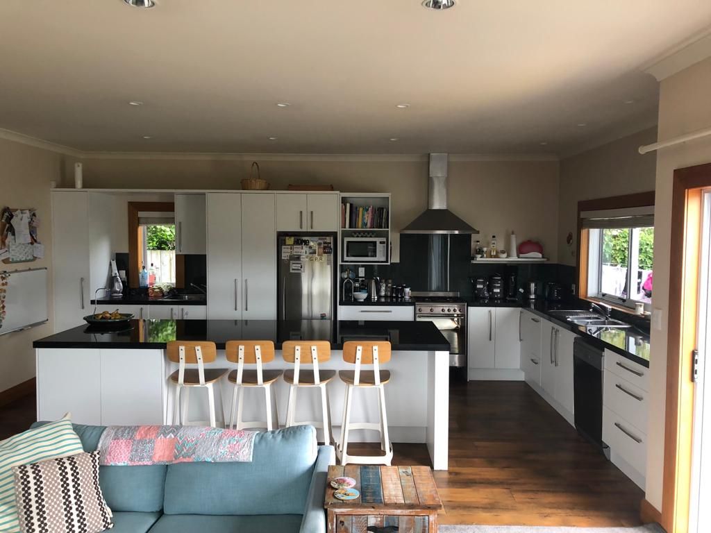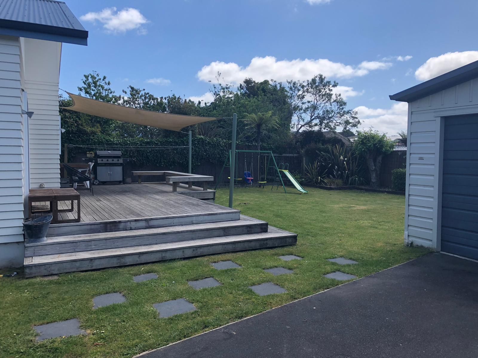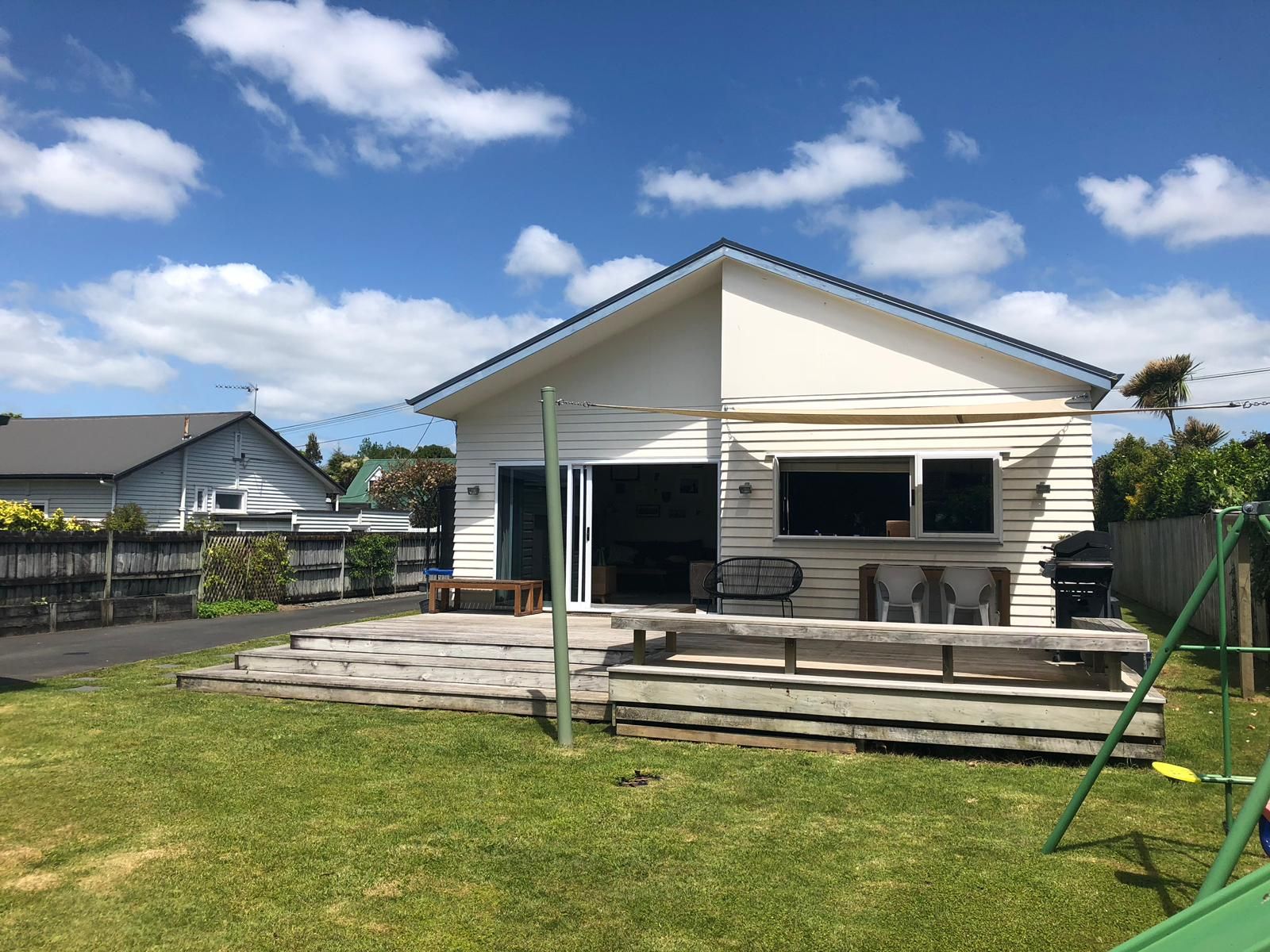 Big open plan new kitchen leading out to a large sunny deck with shade sail.