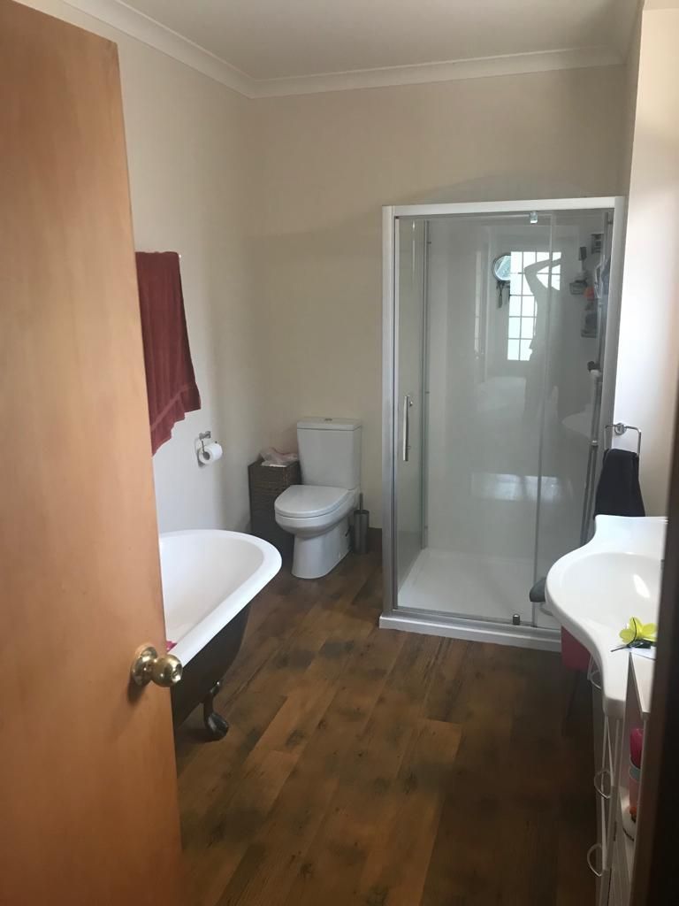 Bathroom has claw foot bath, separate shower, toilet and vanity.