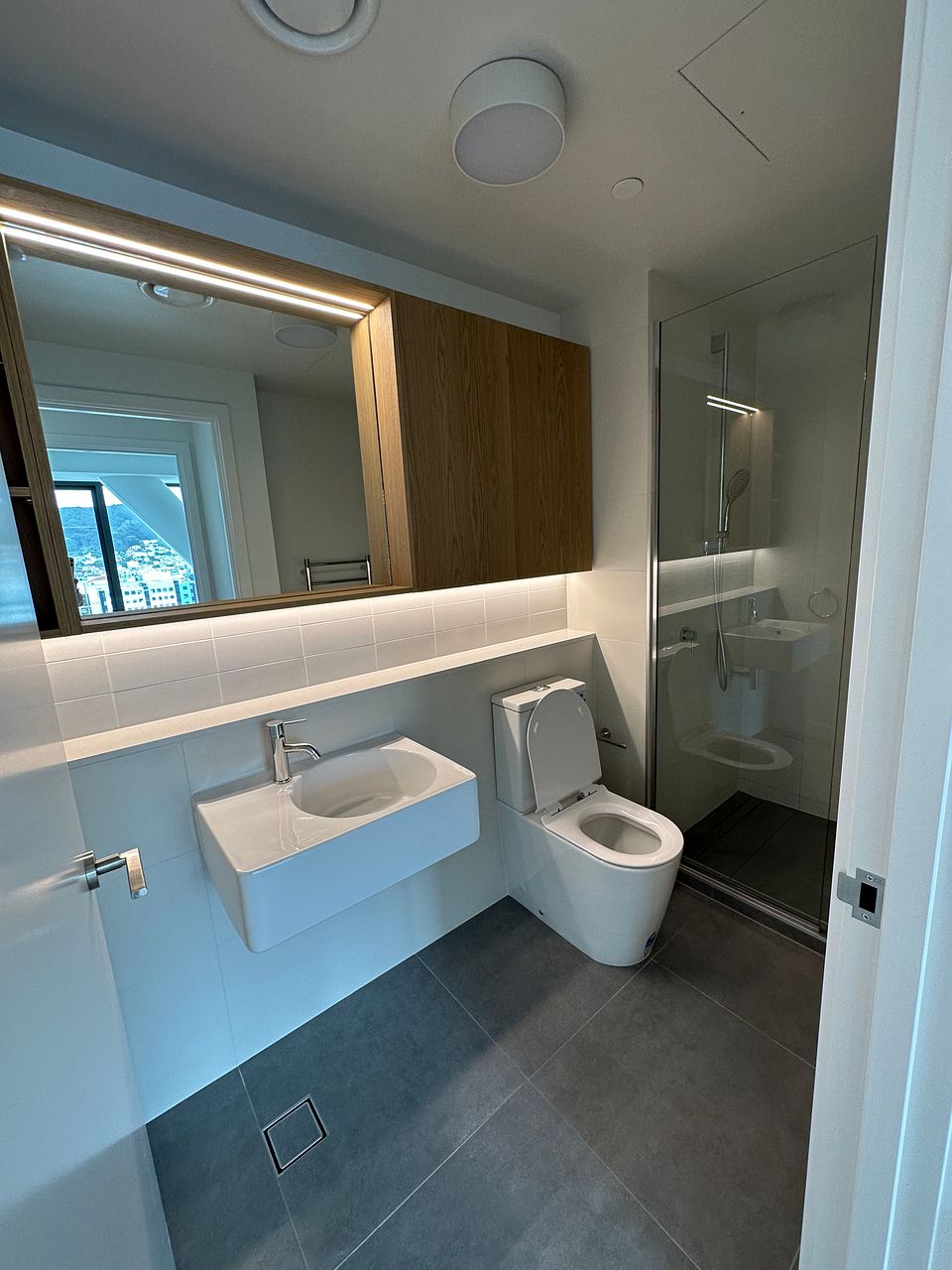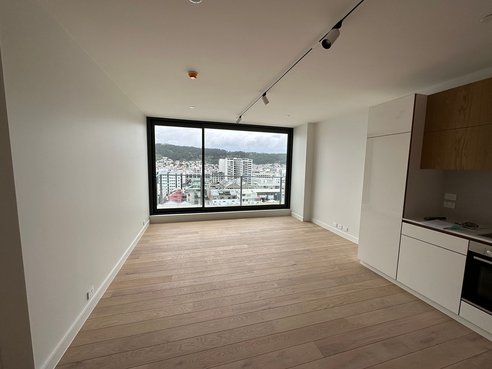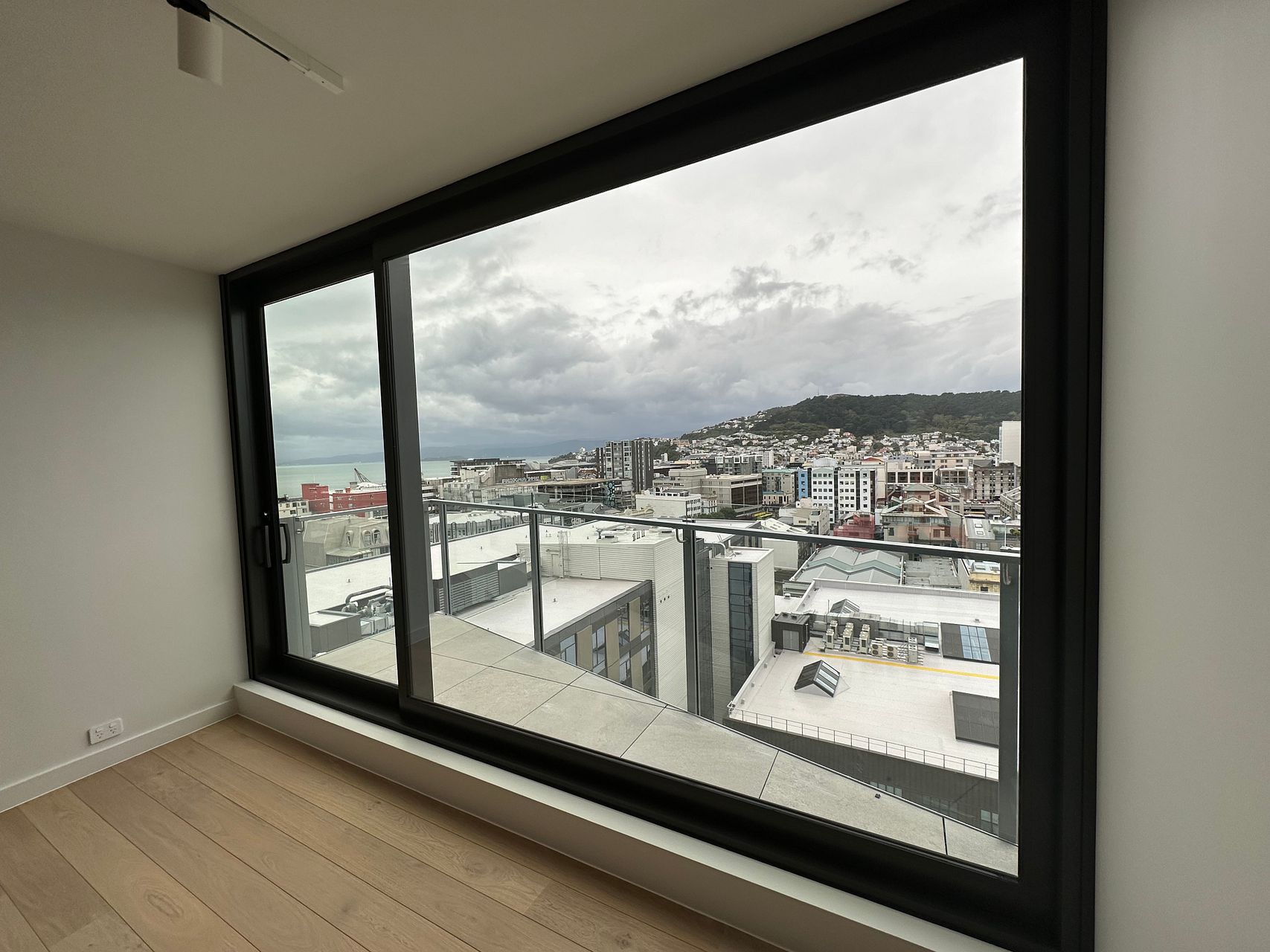 This near new (one year old) modern apartment is filled with light from floor to ceiling with amazing views of the city, harbour, Mt Victoria and beyond from both the living room and the bedroom.