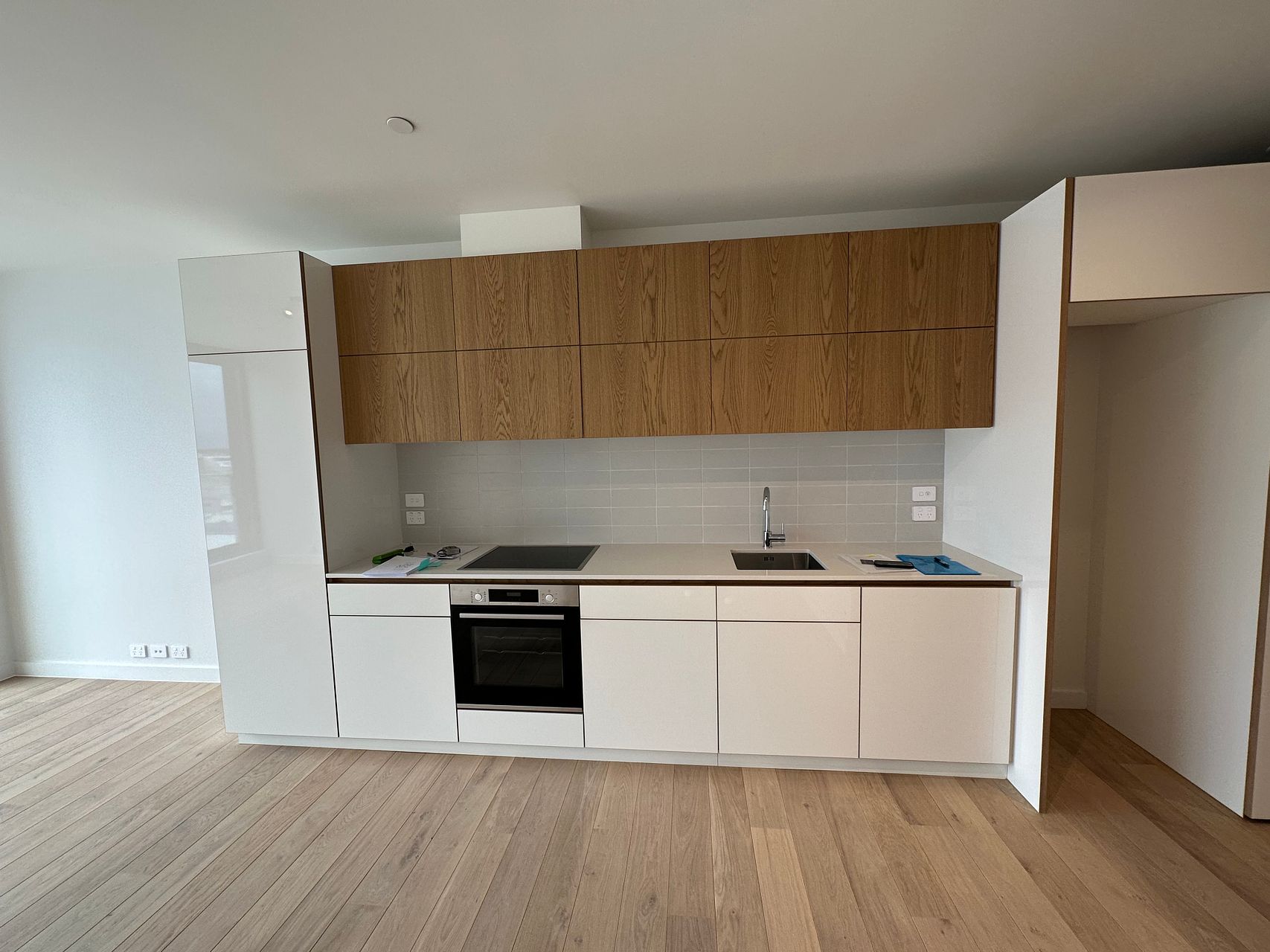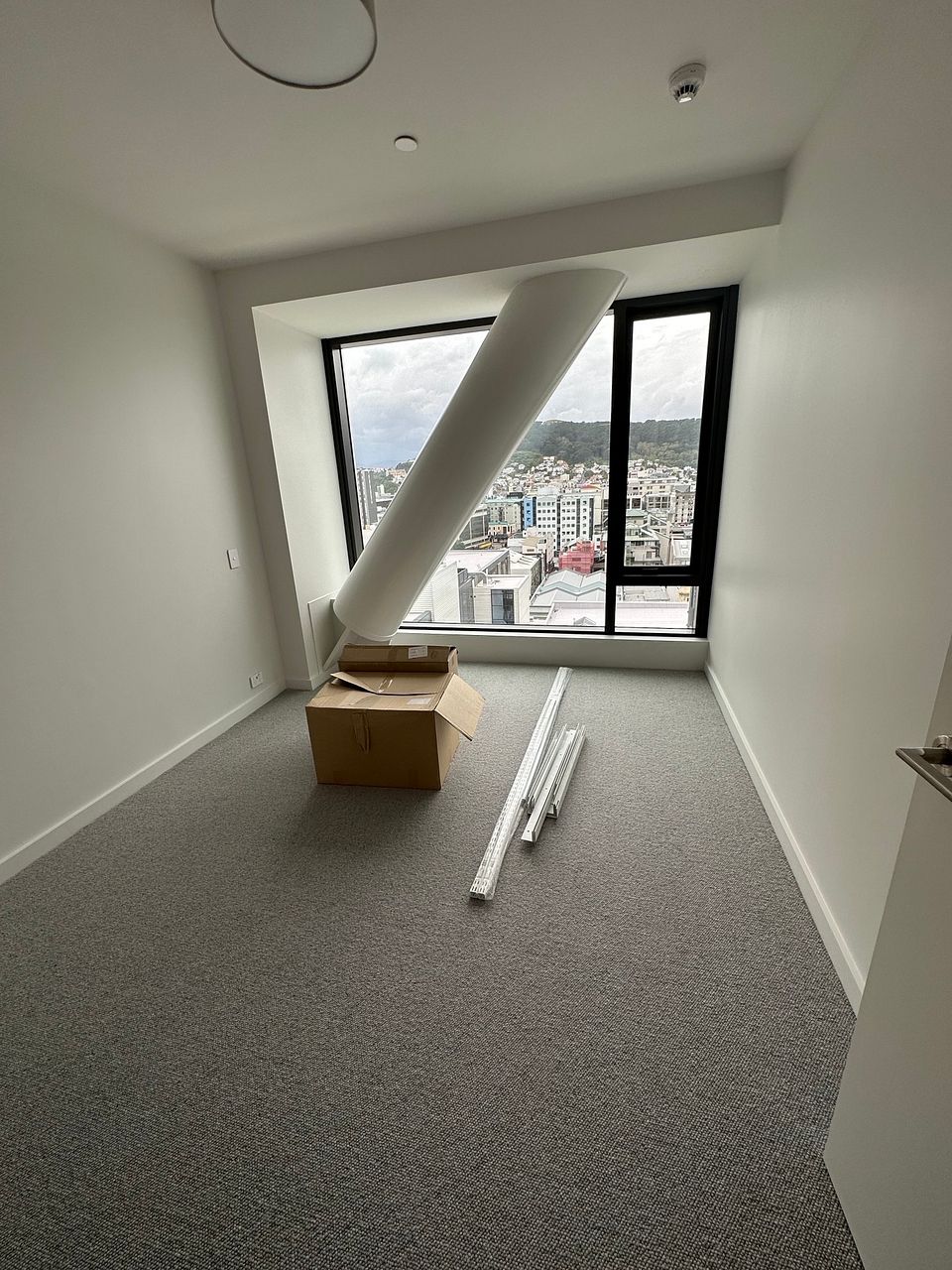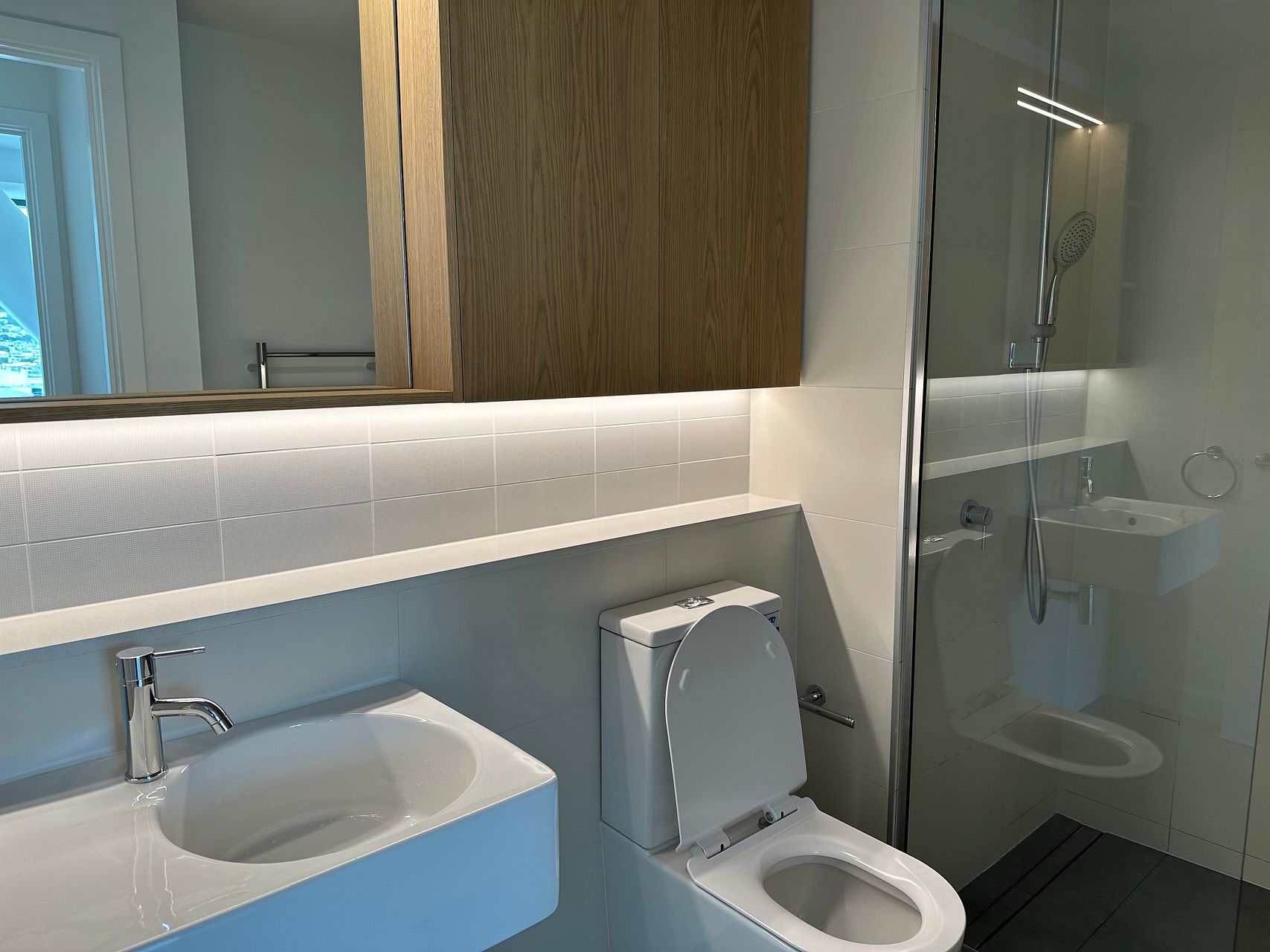 This near new (one year old) modern apartment is filled with light from floor to ceiling with amazing views of the city, harbour, Mt Victoria and beyond from both the living room and the bedroom.