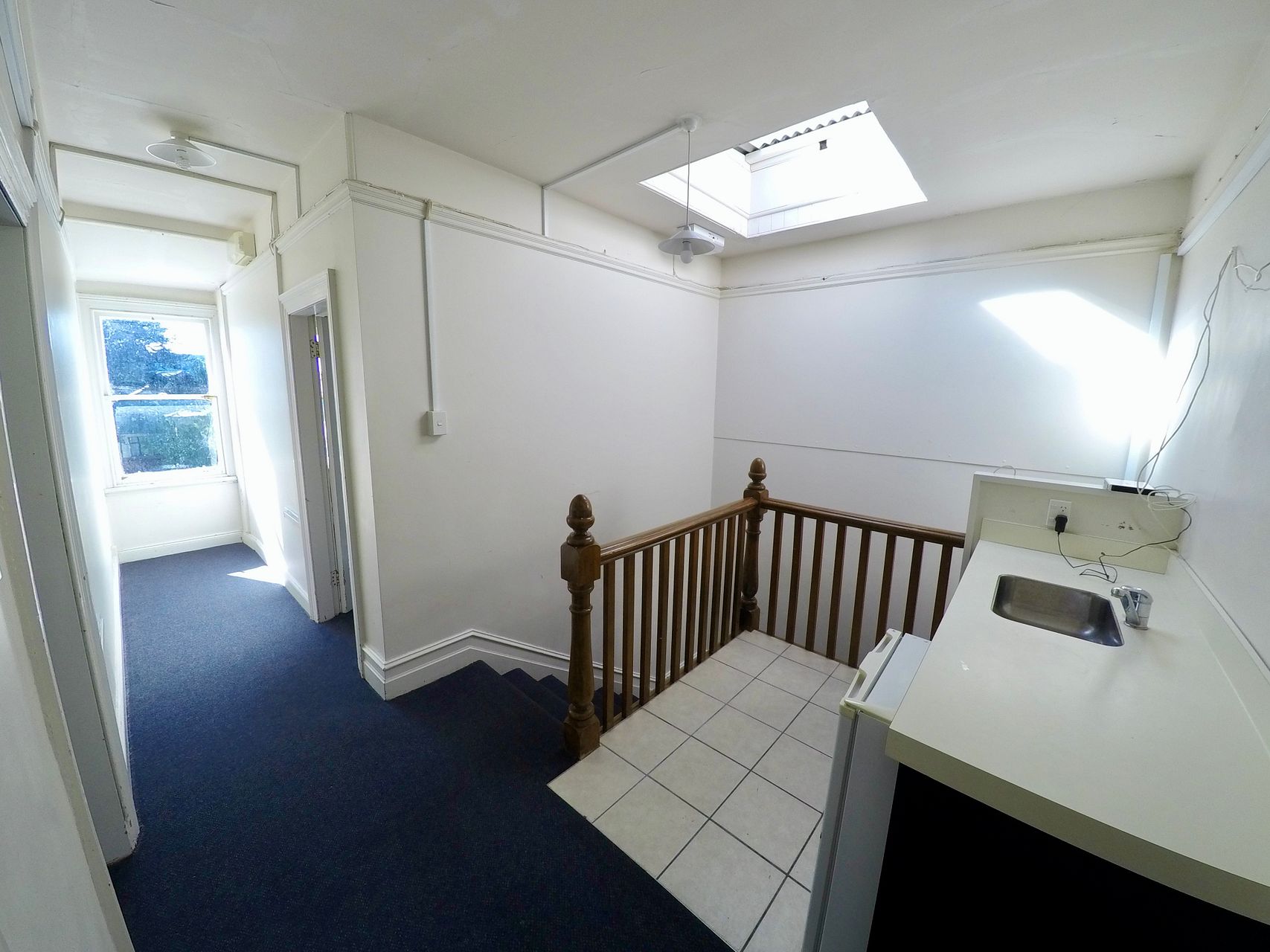 - Kitchenette on upper floor with sink, benchtop, sink and space for underbench fridge.