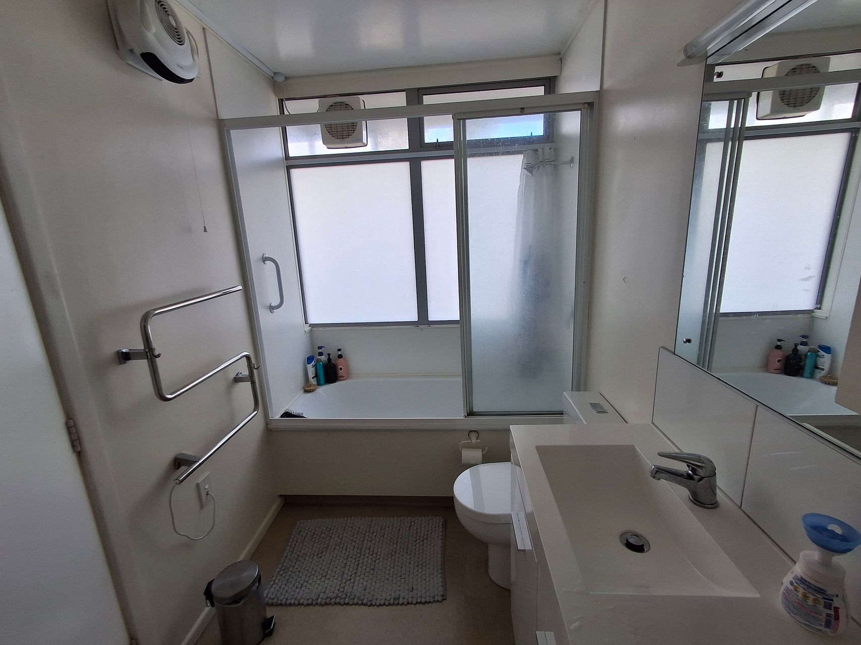 Shower over bath and tidy laundry. Common garden space for free use.