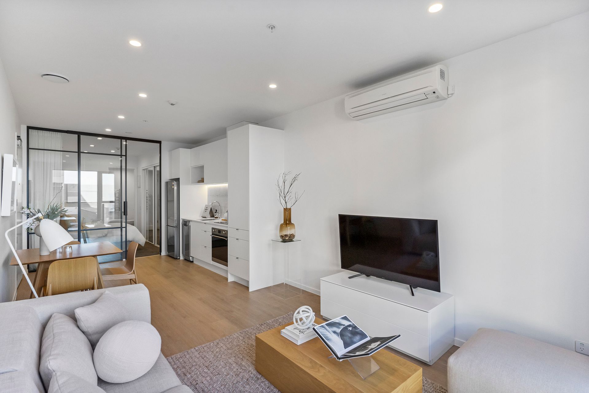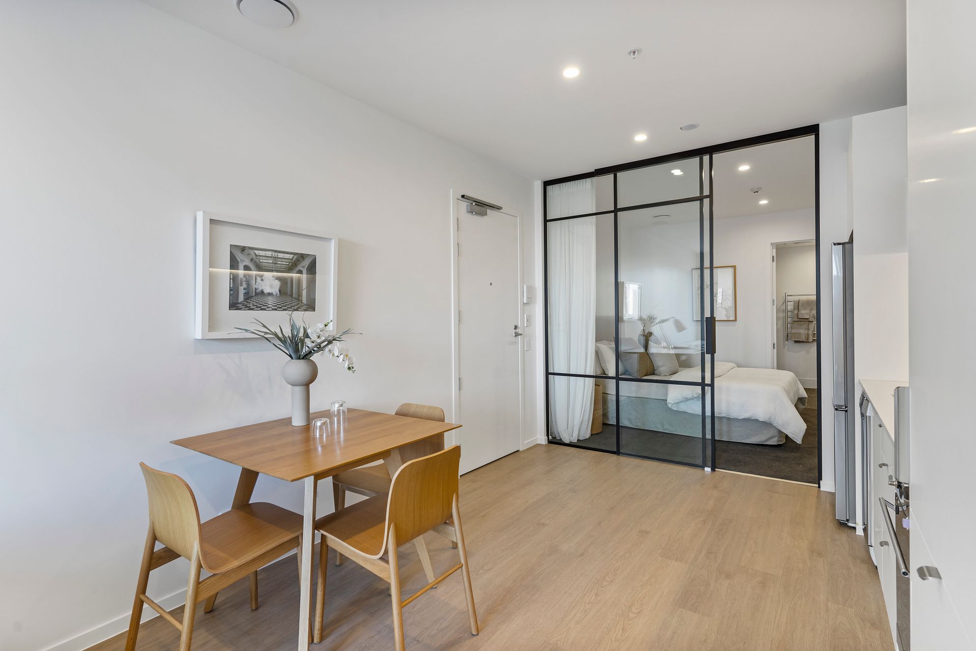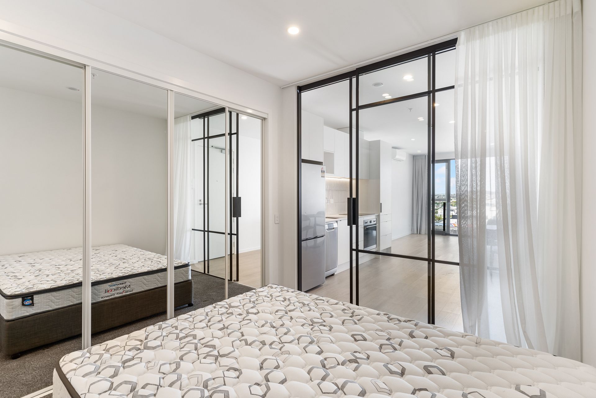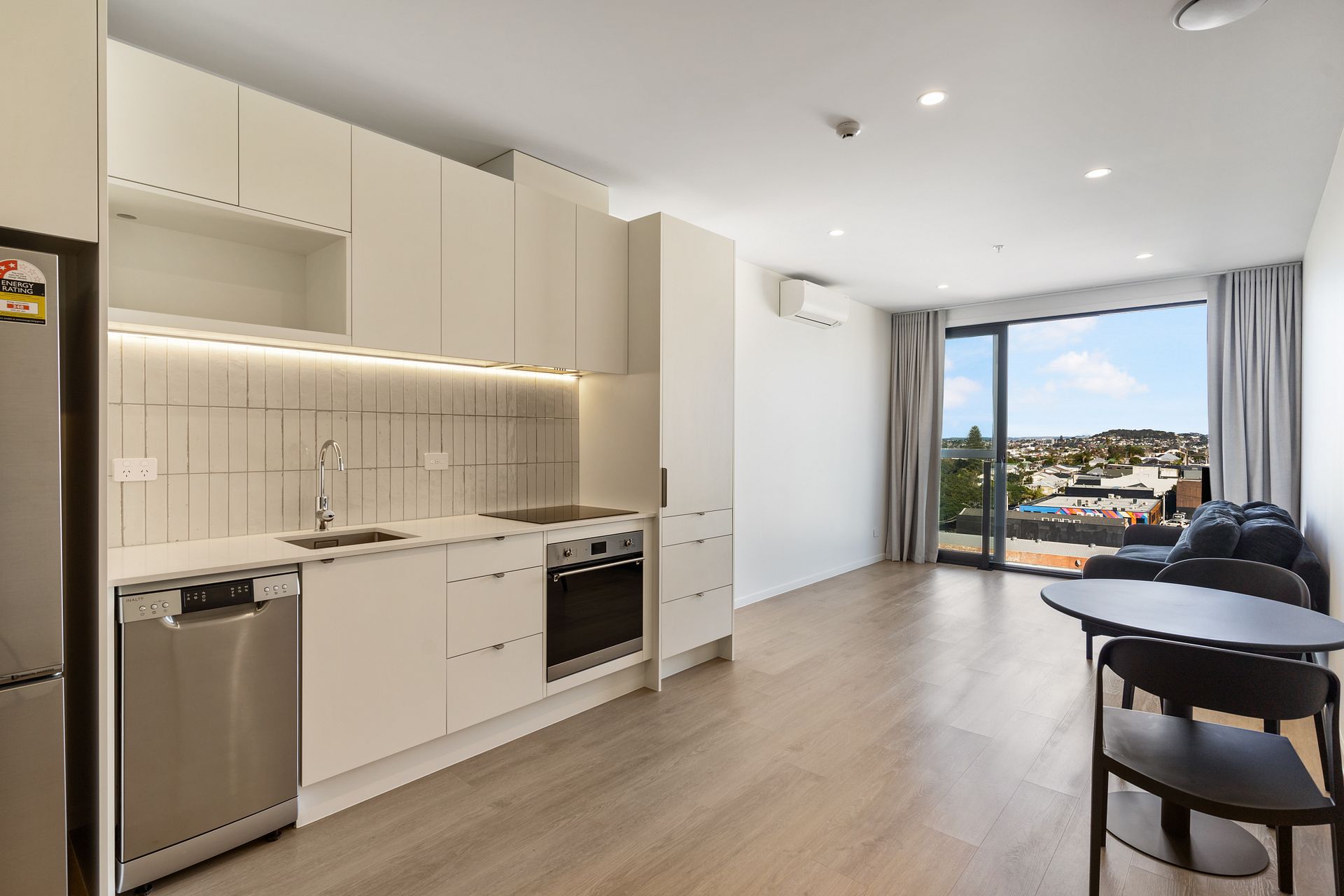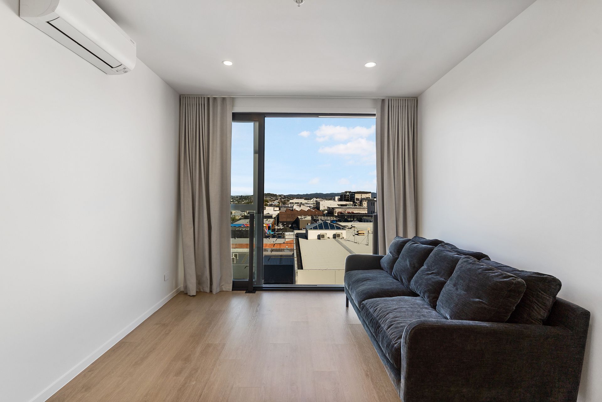501 is 1 bedroom 1 bathroom on level 5, comes with a stainless steel fridge/freezer, dishwasher, heat-pump, washing machine-dryer combo, Samsung cordless vacuum cleaner, secure bike storage, storage lockers, and keyless entry via your smartphone. This apartment #501 can be semi-furnished with a Queen bed, dining table and chairs plus a Cuchi Sofa for additional $25pw. Available from 20th March. Secure carparking from $80pw.