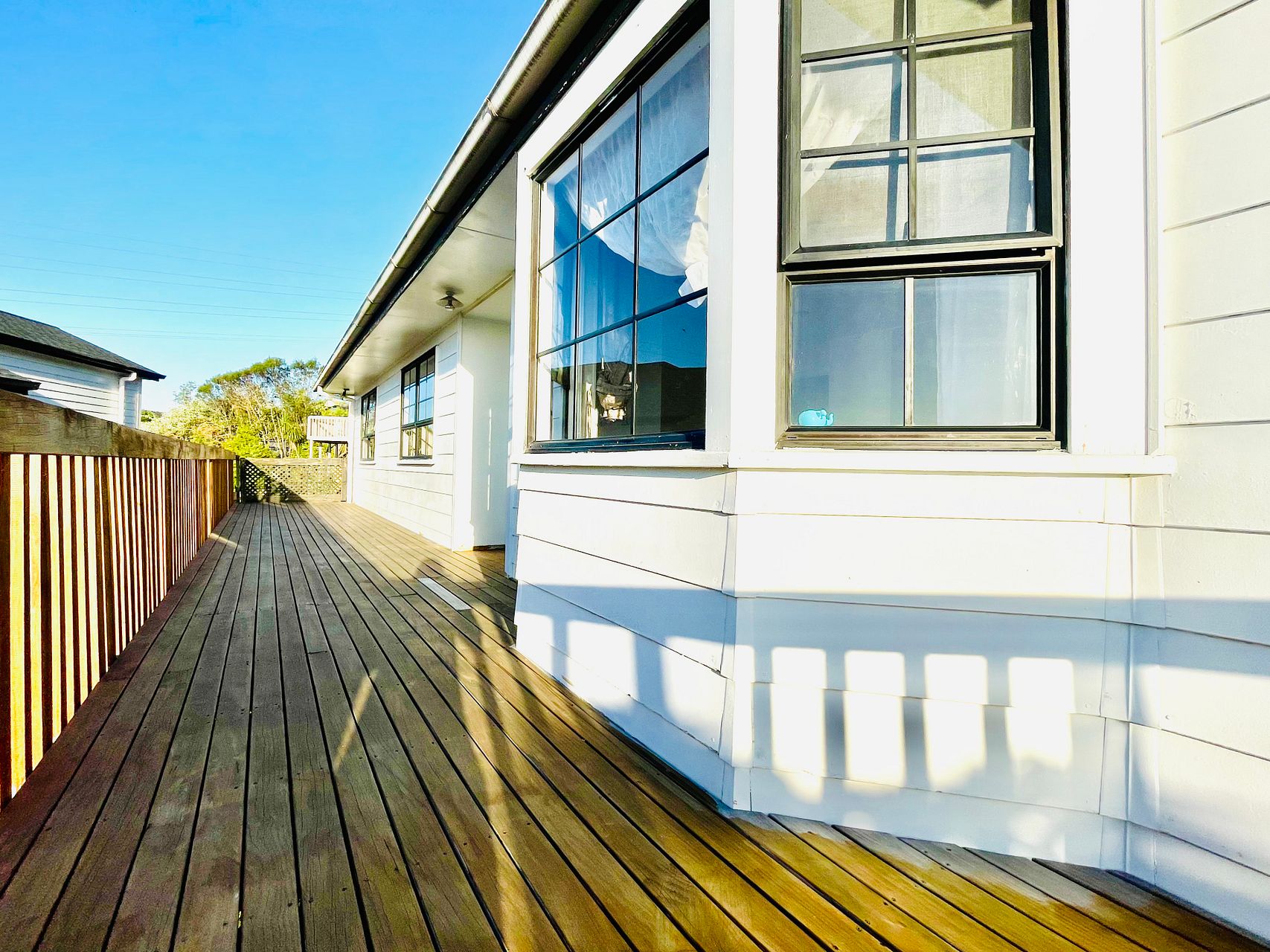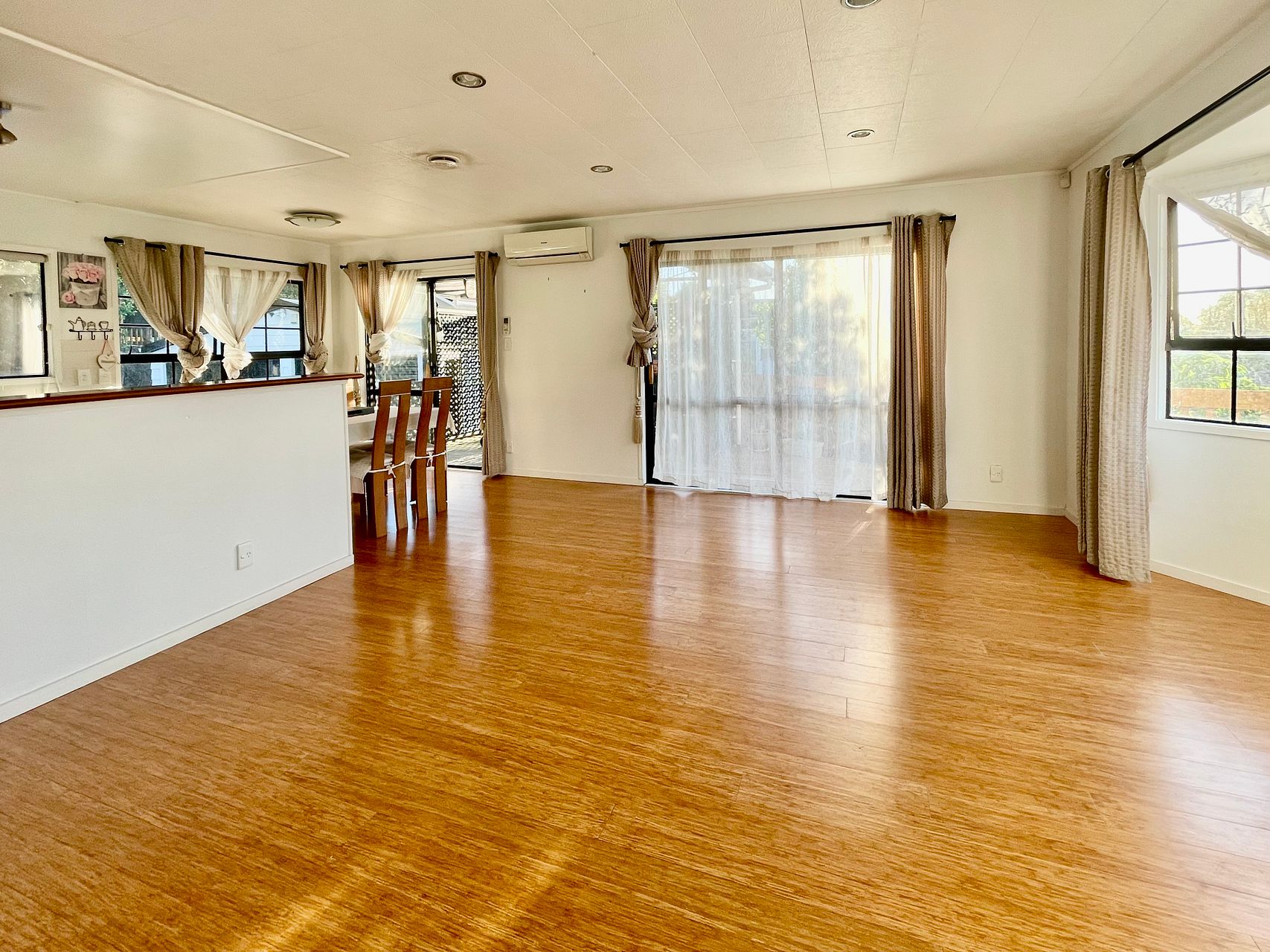 Open plan Lounge, kitchen , dining room leading to deck and fenced garden.