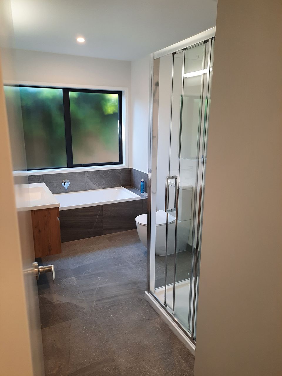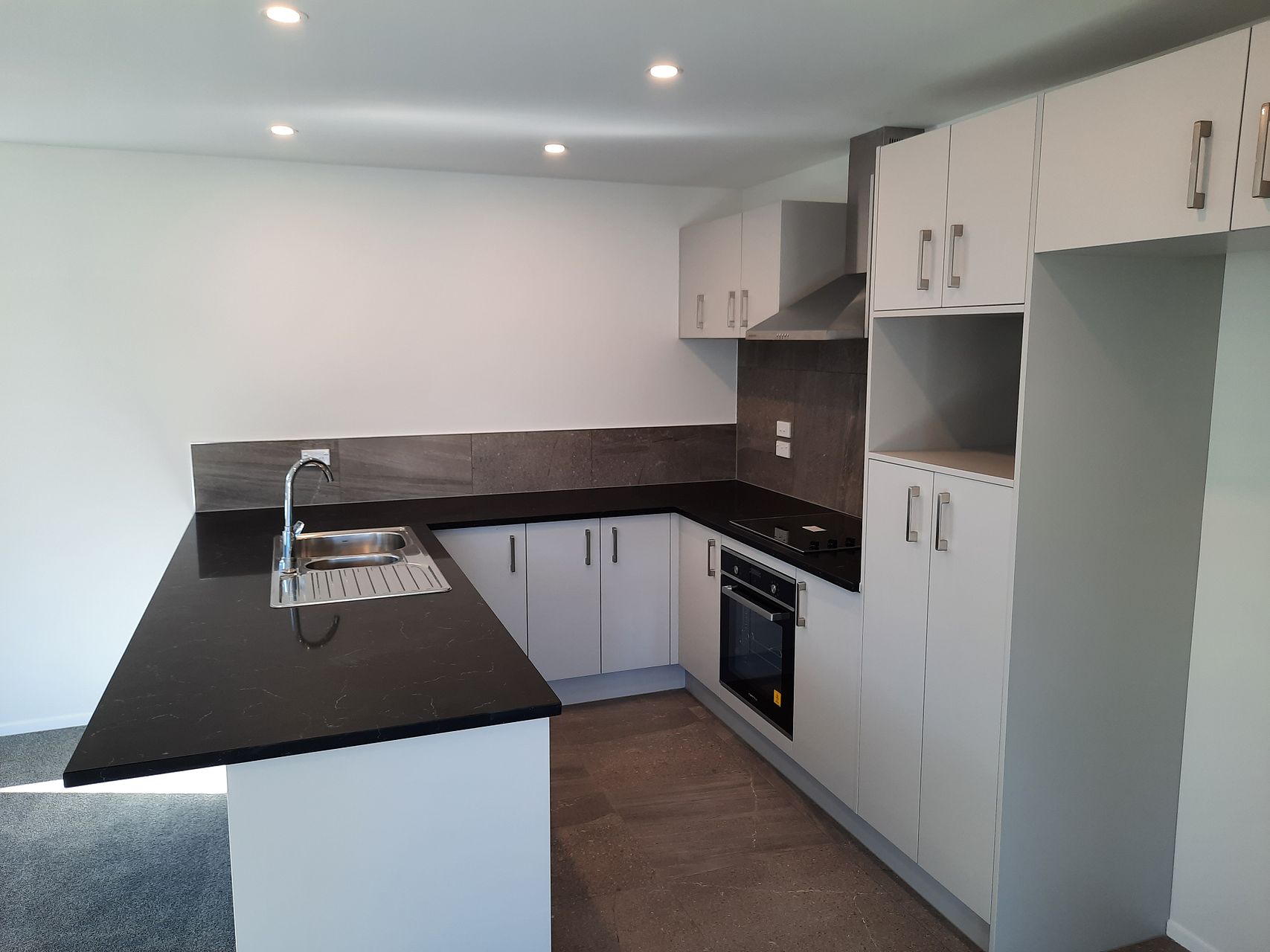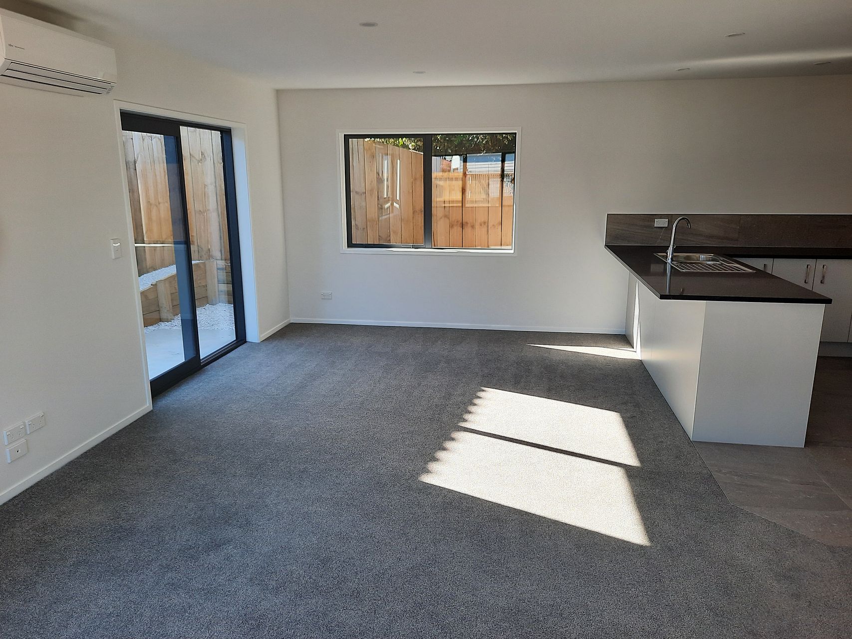 Tiled kitchen and bathroom, quality fittings, fully insulated, with heat pump, built in alarm, Cat 6 network cabling, kitchen island with breakfast bar, and room for a wide double-door fridge.
