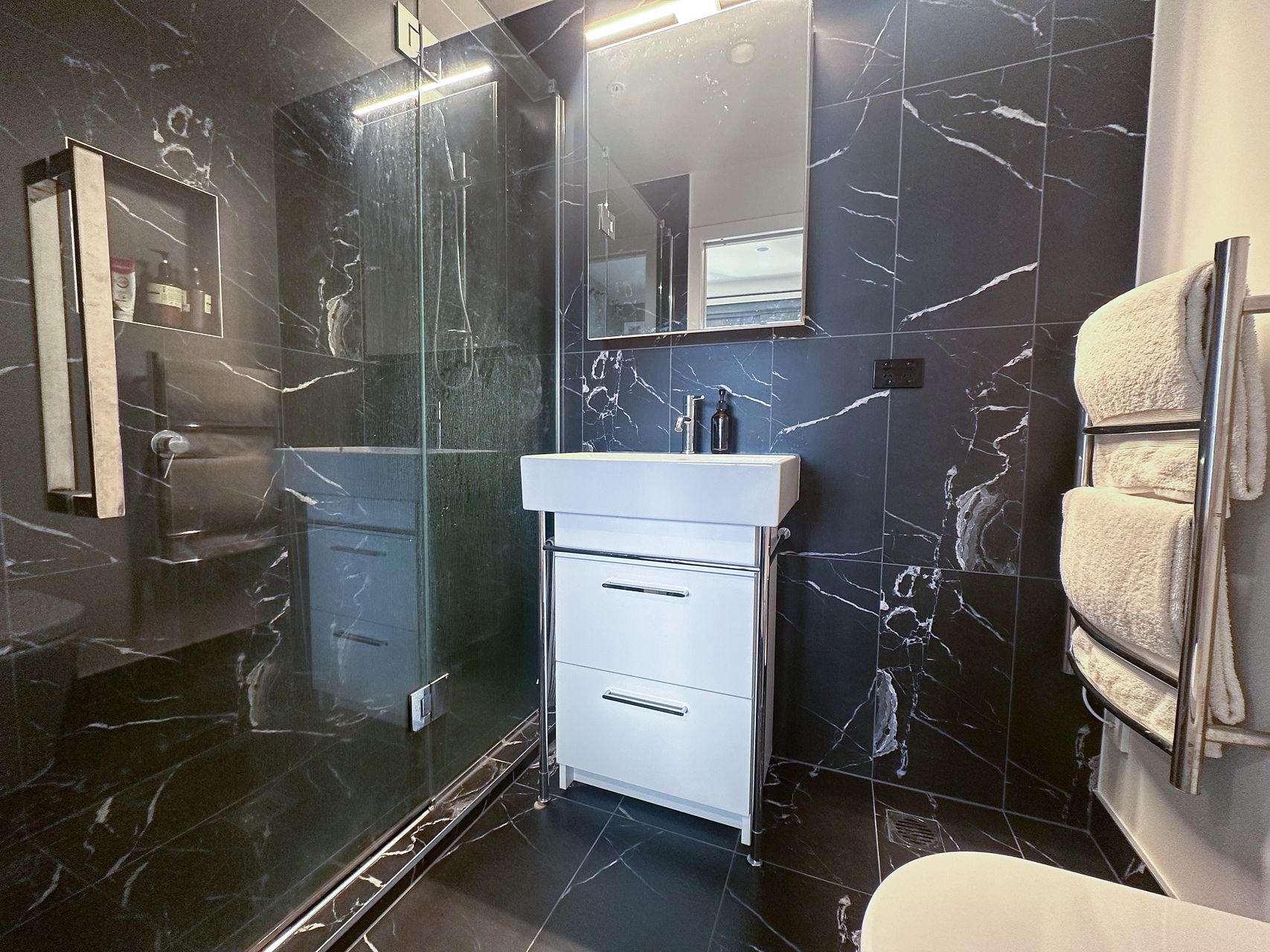 • BATHROOM: Elegant bathroom, featuring luxurious black marble.