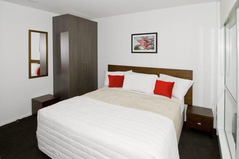 Spacious bedroom with a comfortable bed, ample storage, and natural light.