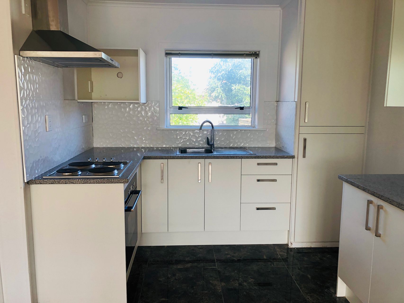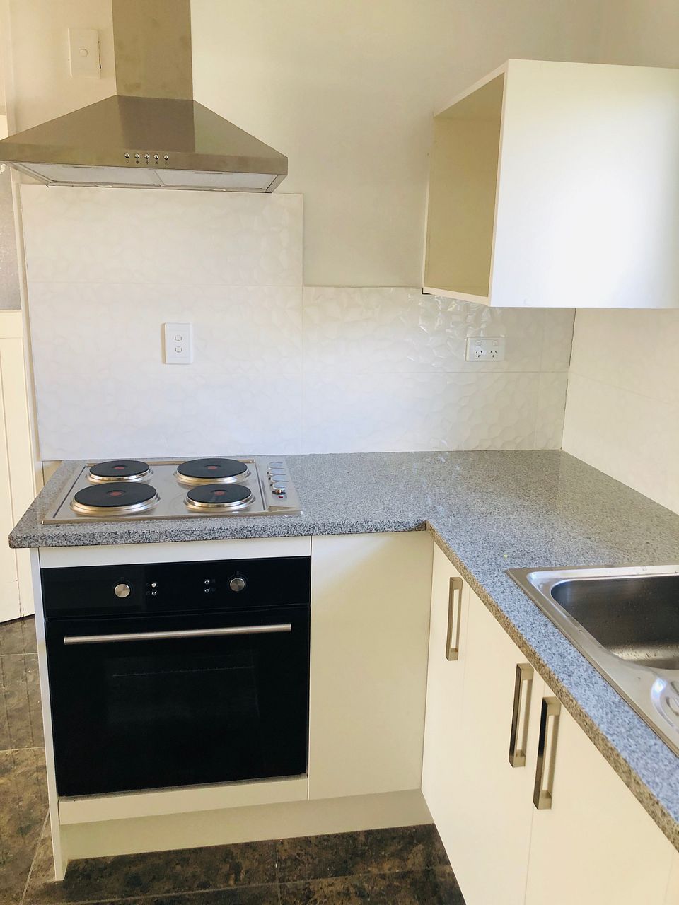 Open plan living with brand new kitchen, stove, range hood and oven.