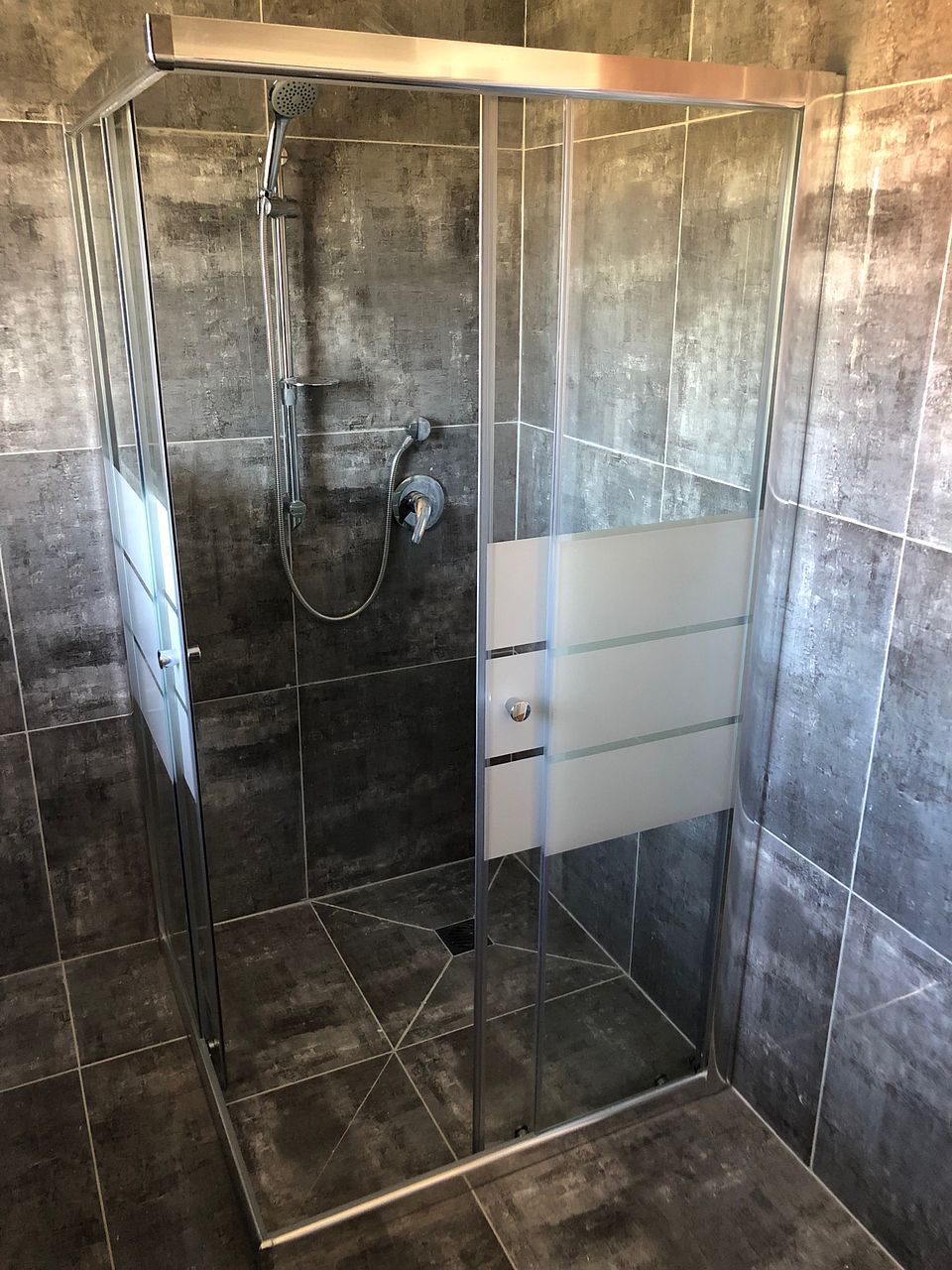 Brand new modern bathroom with tiled walk-in shower.