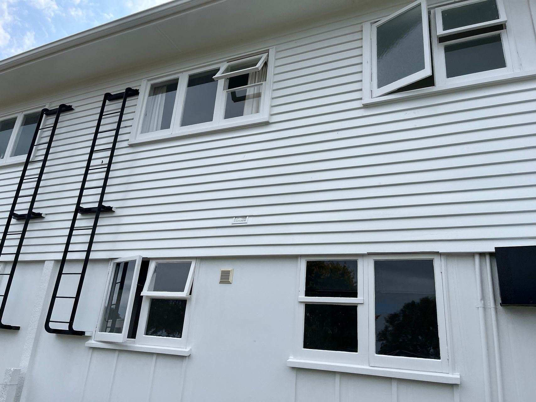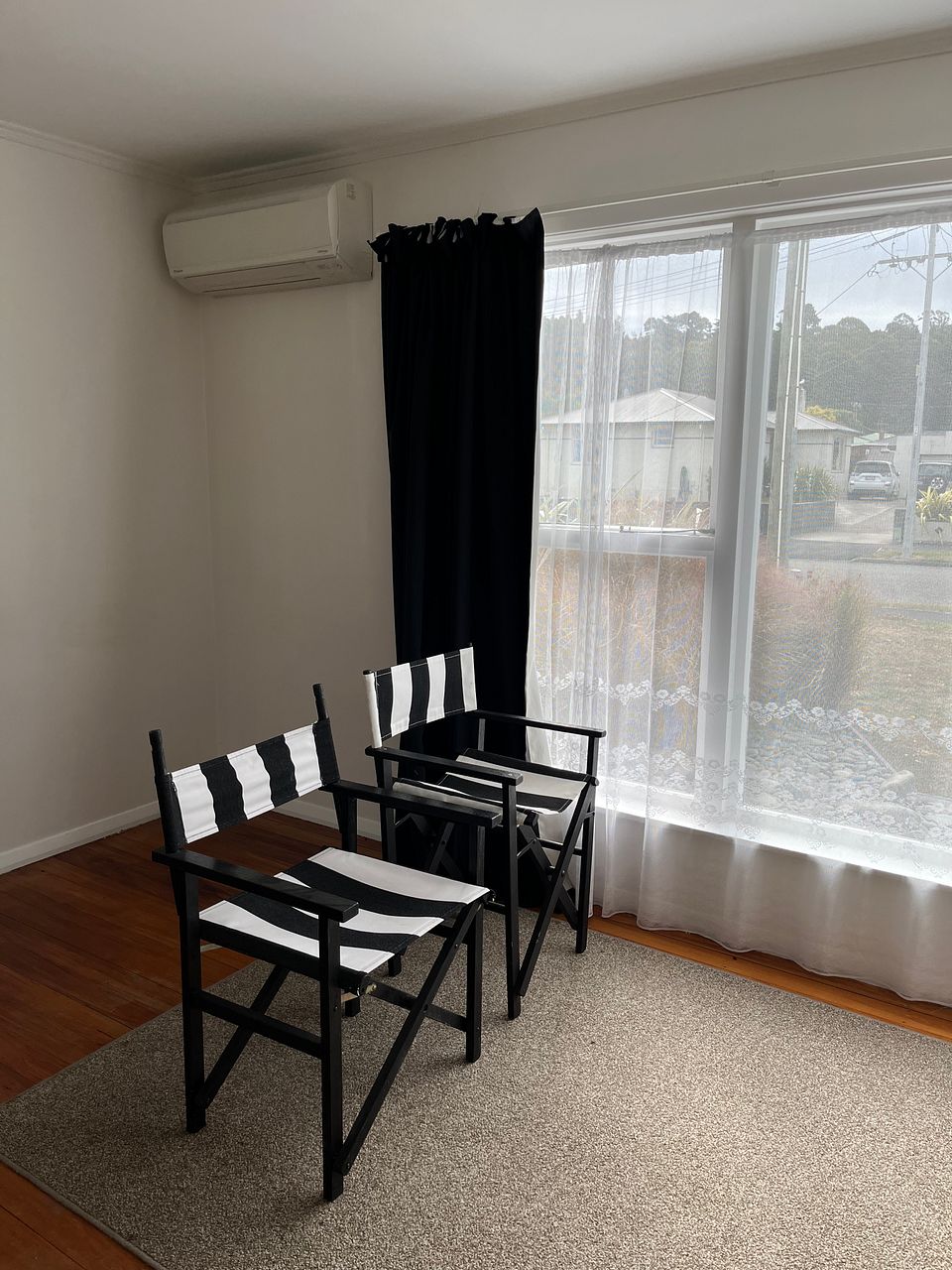 Open plan living and large lounge windows with sun streaming in.