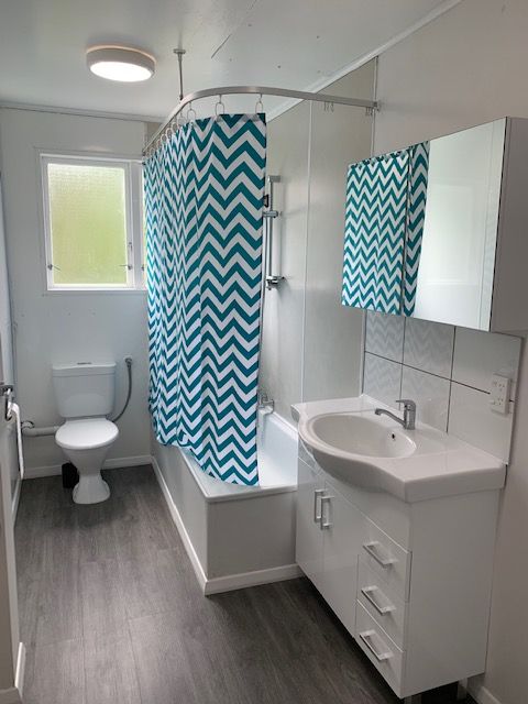 Renovated bathroom with shower over bath, and laundry tub.