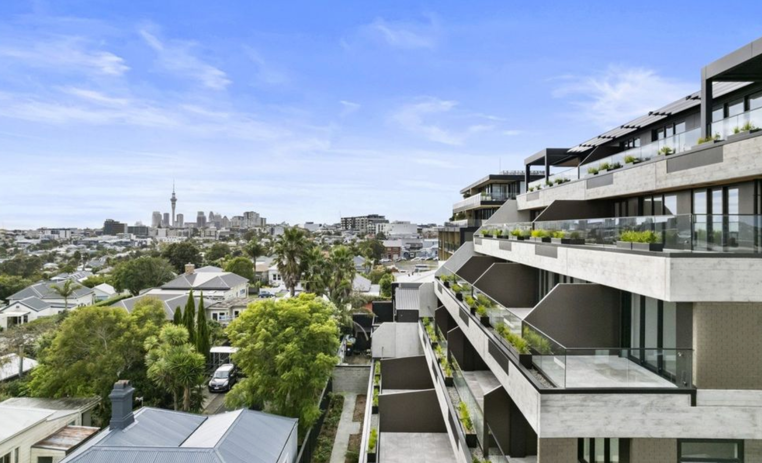 Apartment 304 is bigger than others: this luxurious 83sqm apartment is complimented with a massive 36sqm North facing balcony nestled high up on the 3rd floor, with expansive views out over Grey Lynn, Ponsonby, and out to the harbour… it will capture every last ray of sunshine and is perfect for outdoor living. (NB: only levels 3 & 4 in the Grey have unobstructed views like this)