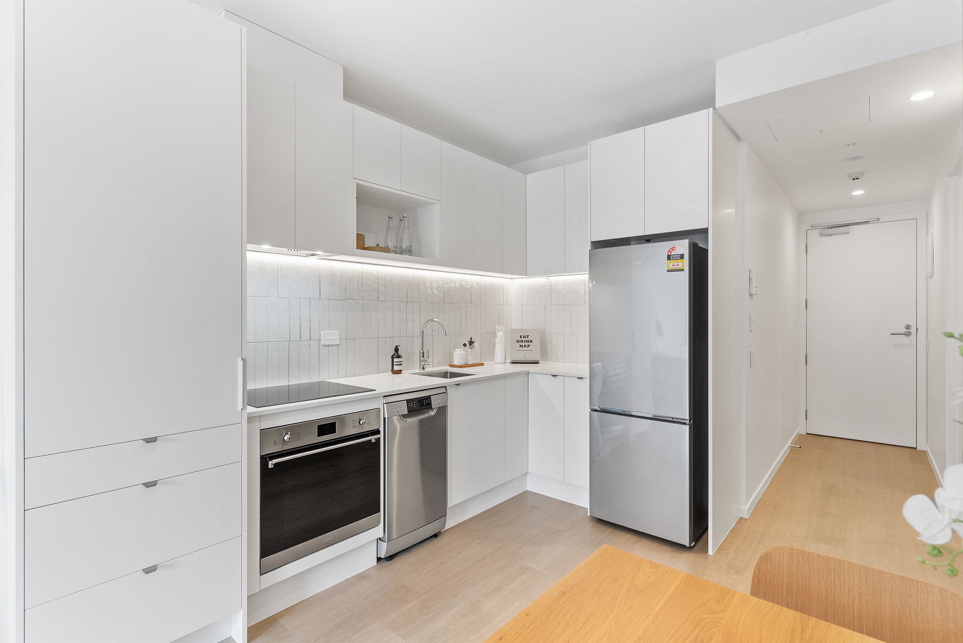 404 is on level 4 and is the only 1 bed+flexi room apartment available in the entire building. It can be semi-furnished with bed, dining set & sofa for $25pw. The weekly rent of $760 includes a stainless steel fridge/freezer, dishwasher, heat-pump, washing machine-dryer combo, Samsung cordless vacuum cleaner, secure bike storage, storage lockers, and keyless entry via your smartphone. Gated carparks are $80pw each.