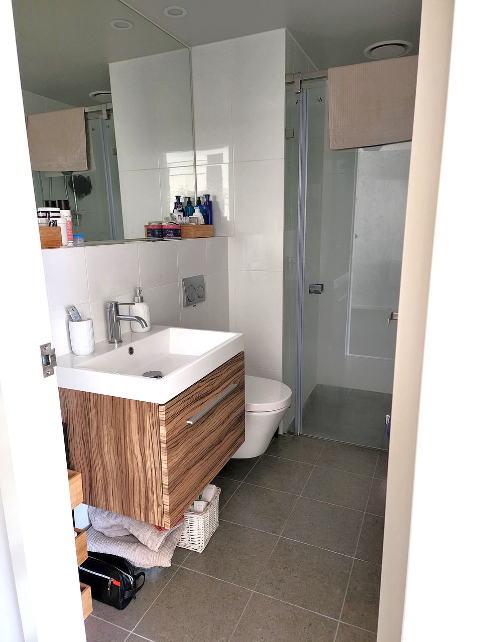 – Bathroom is tiled and has heated towel rail, shower, vanity, and toilet