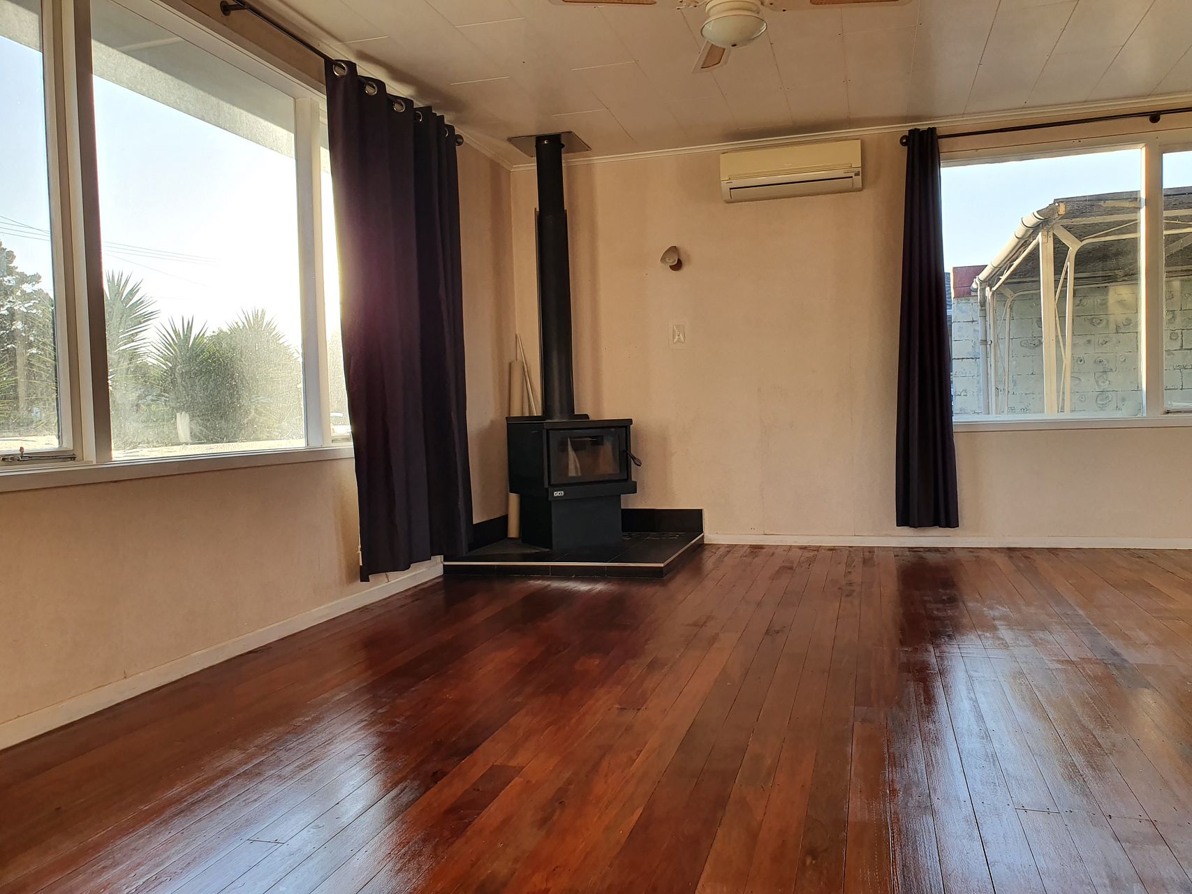 The lounge is spacious and open plan with the dining room, with a wood burner in the corner for winter heating plus a heat pump for year-round air conditioning.