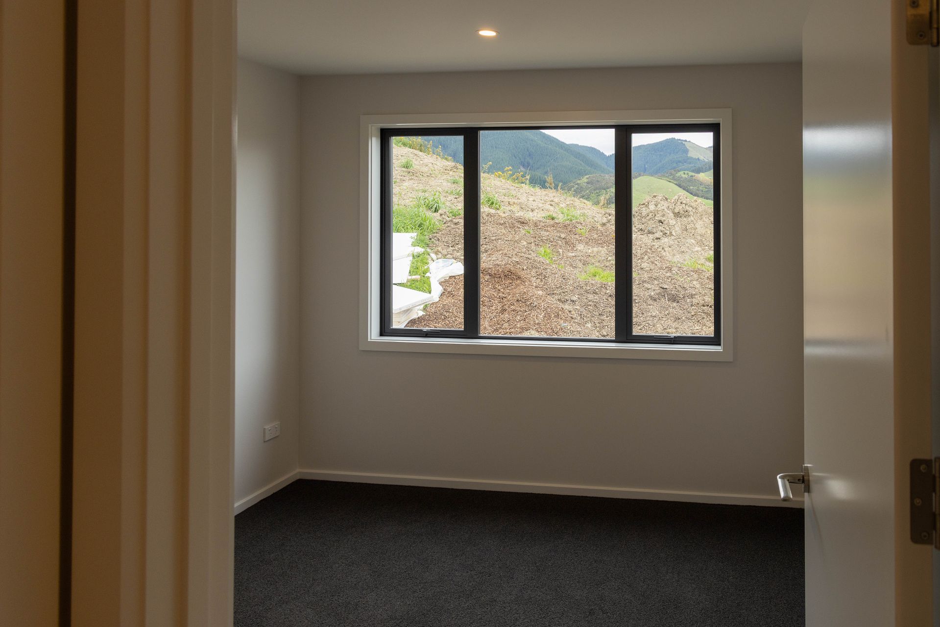 Private Outdoor Living: A large 2.7m sliding door opens from the living room onto a west-facing patio. Paths lead to another private and sheltered grassed area, offering a peaceful outlook towards green hills.