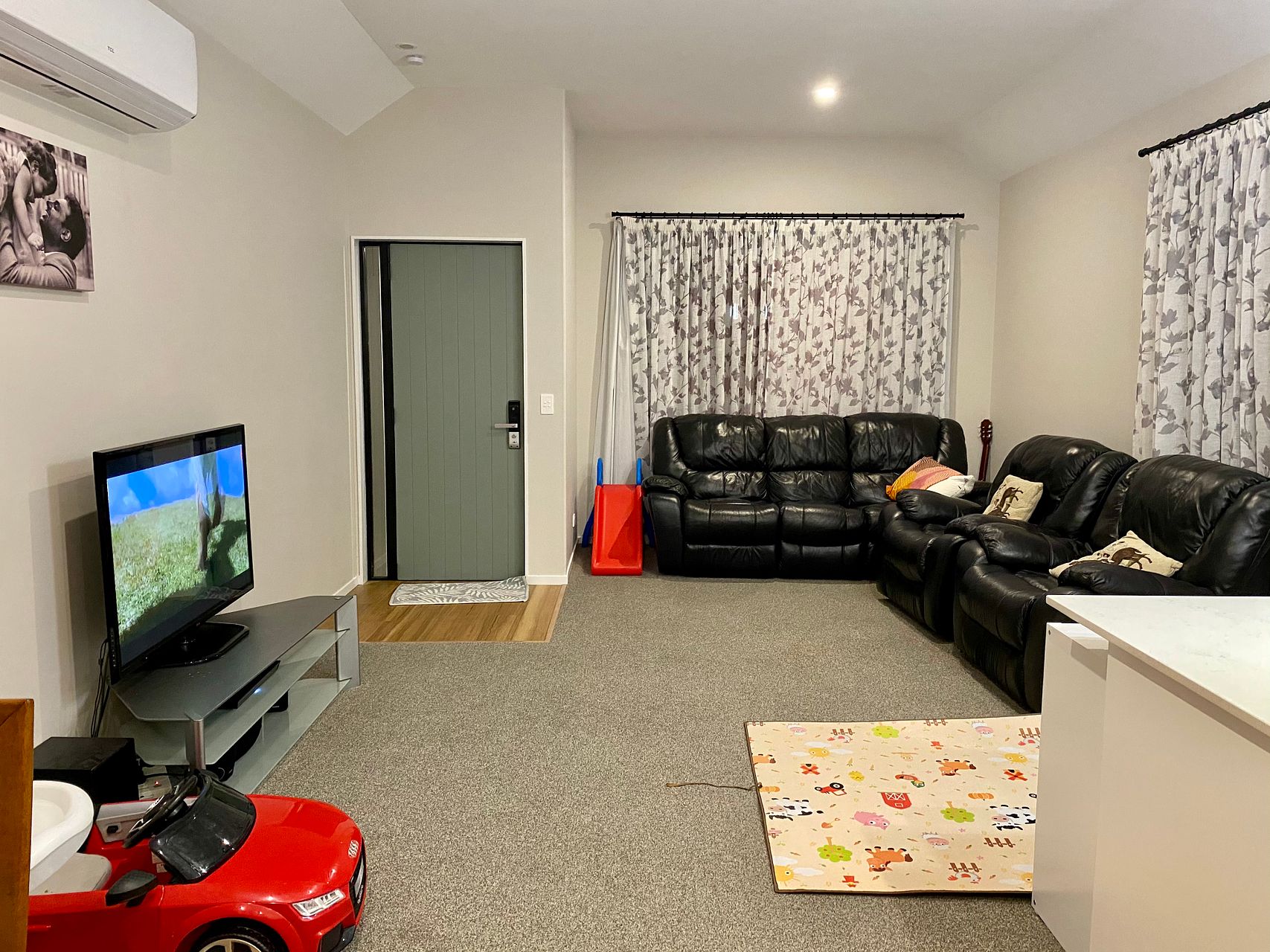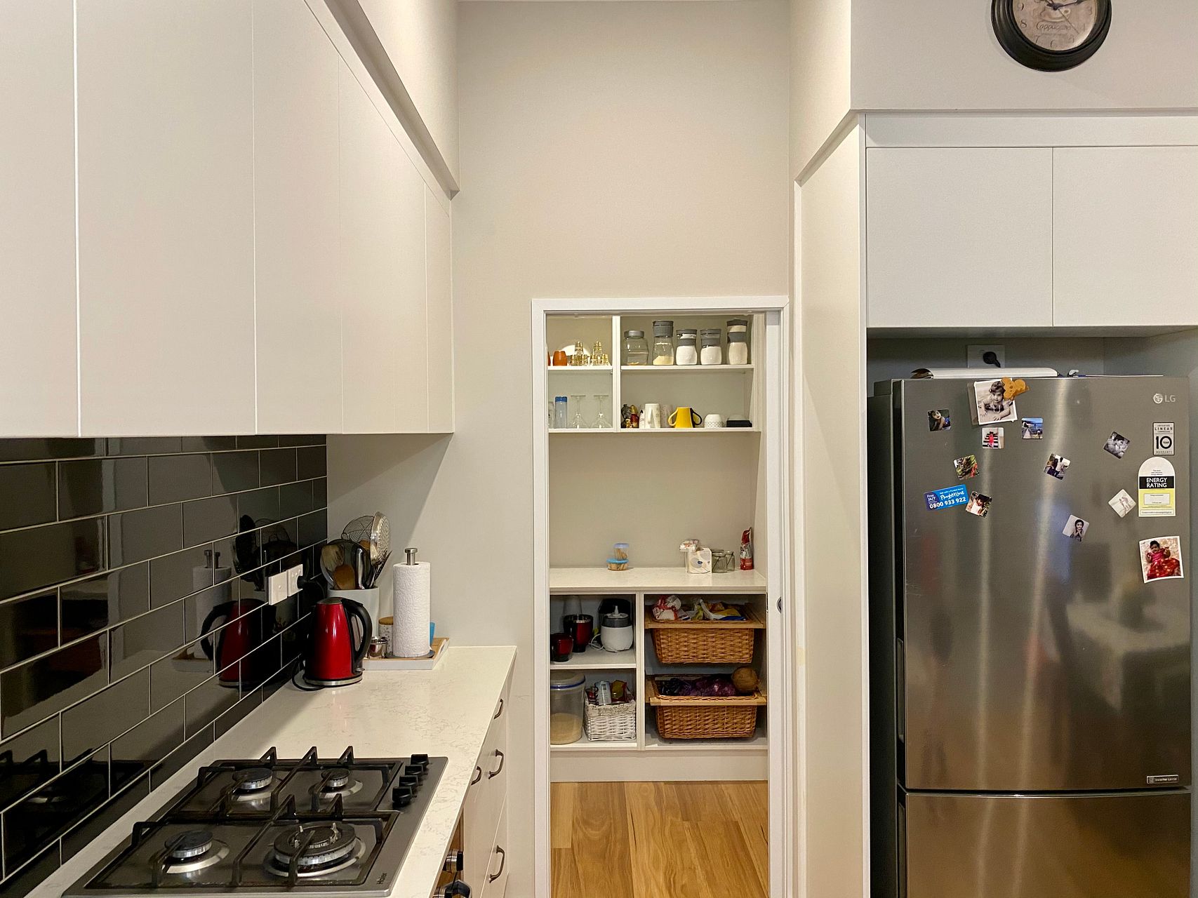 -Open plan kitchen with walk-in pantry and living.