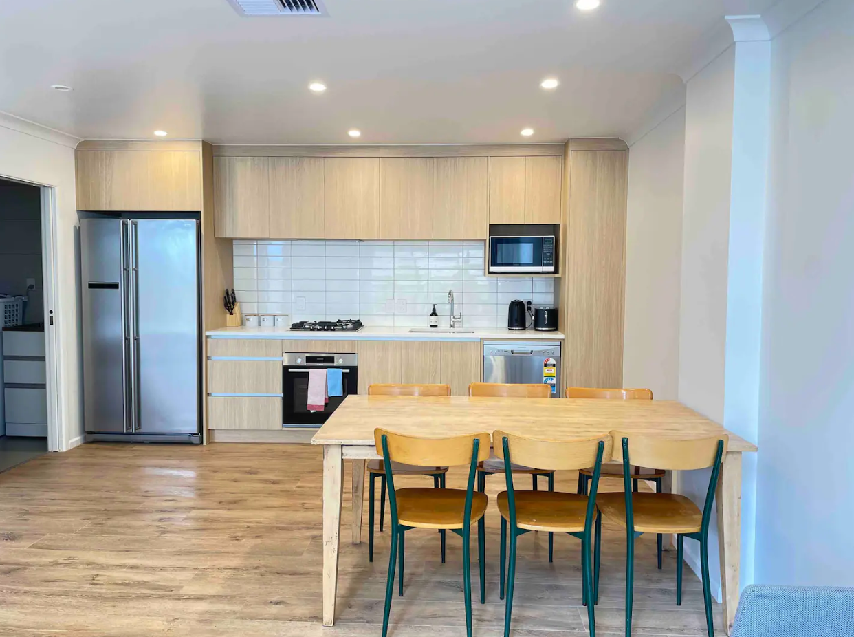 Open plan kitchen with Bosch gas cook top. Oven and dishwasher.