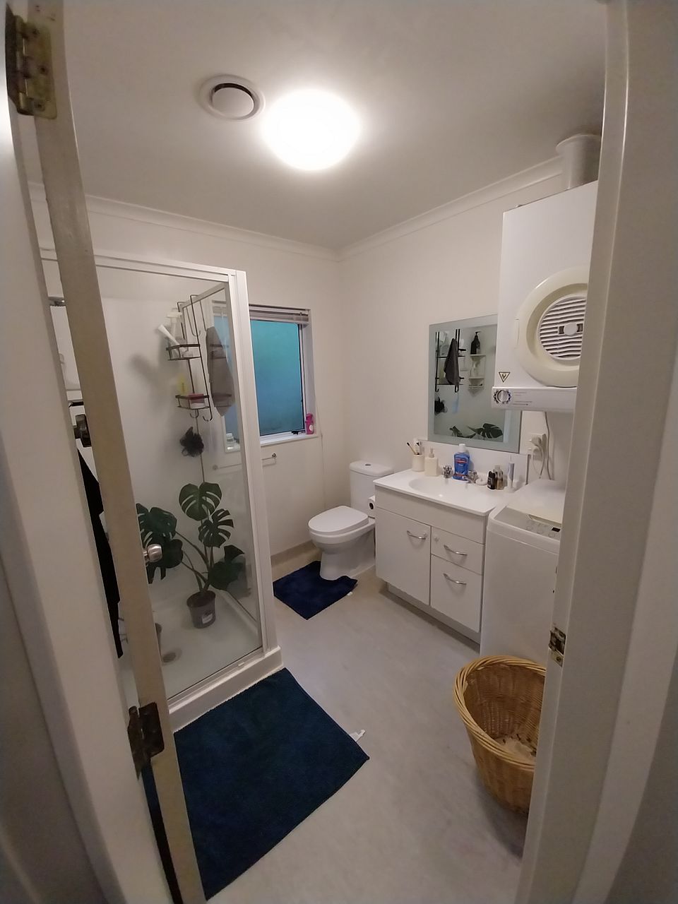 - Bathroom with a shower, toilet, vanity