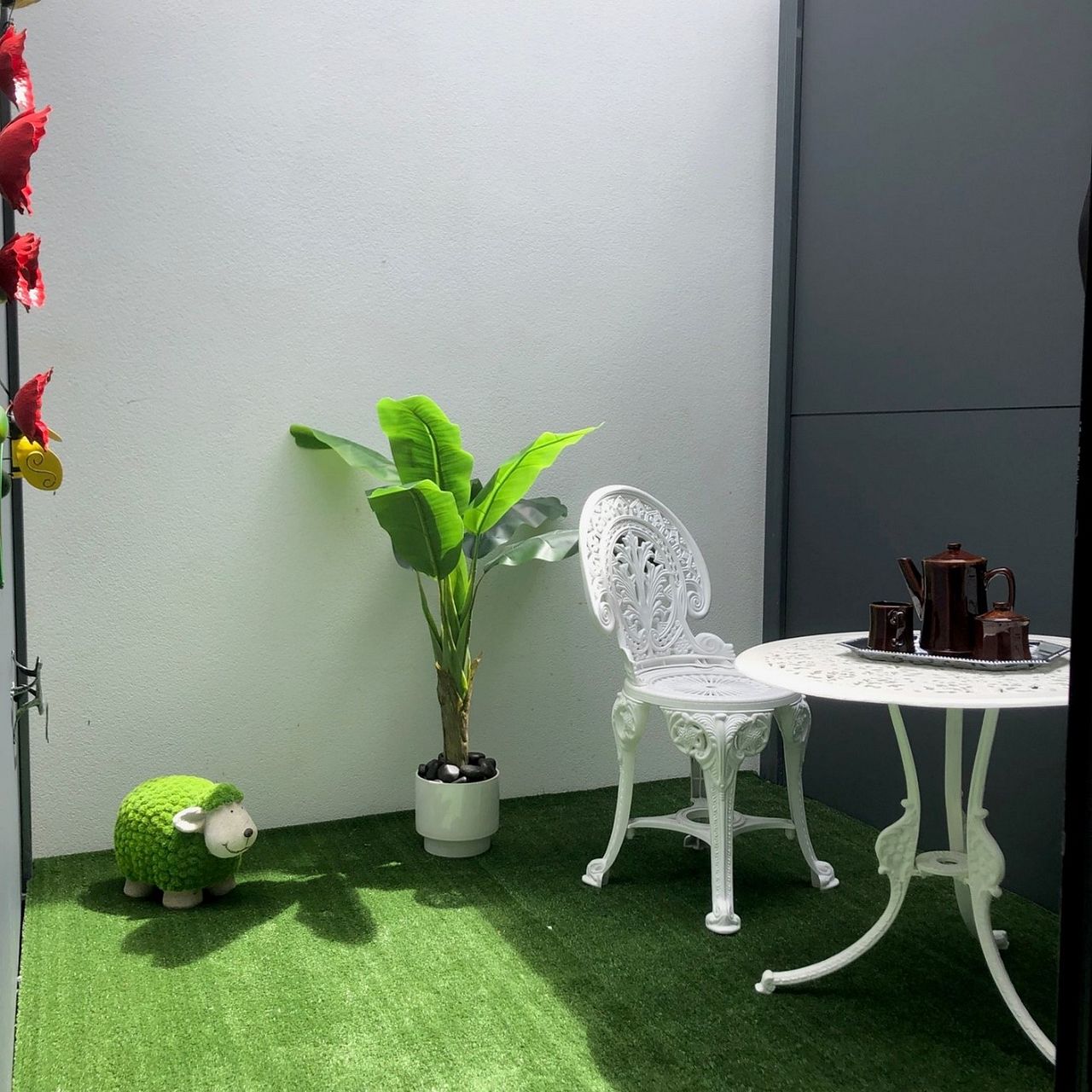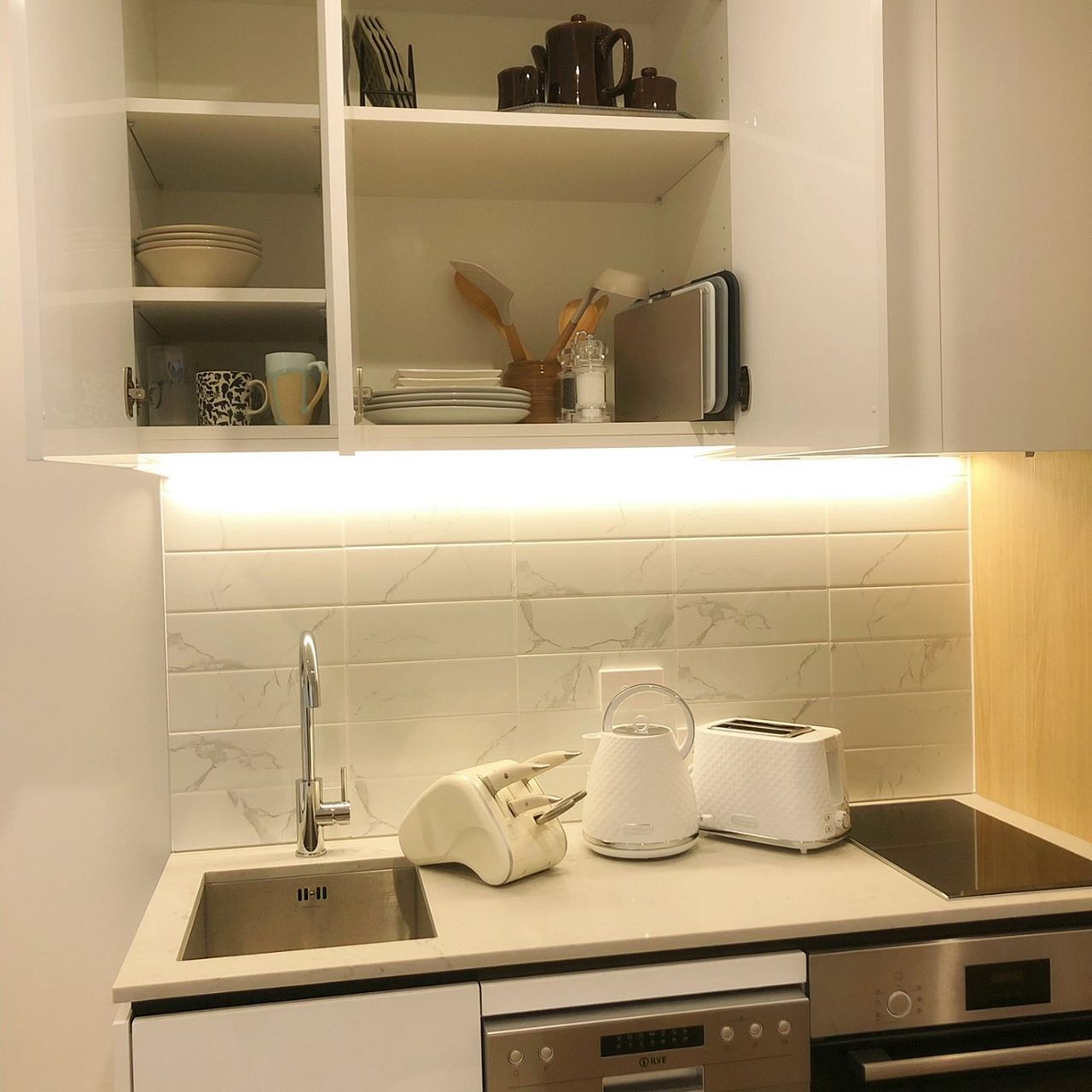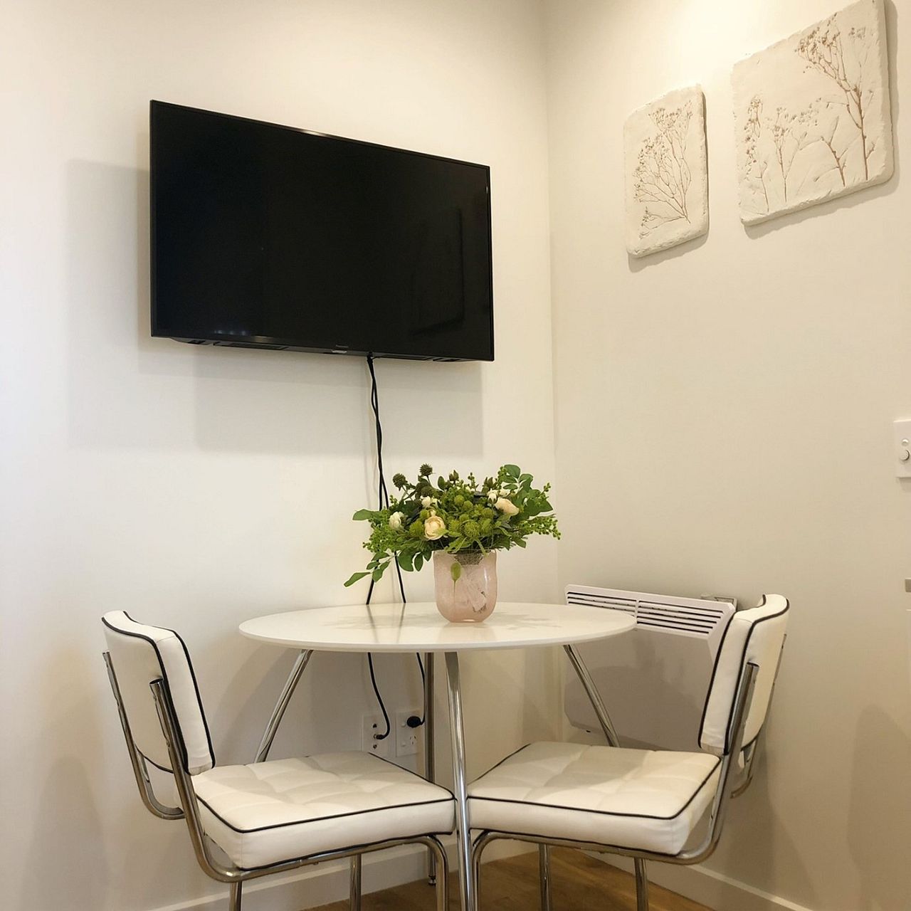• Wall-mounted TV and cupboard space.