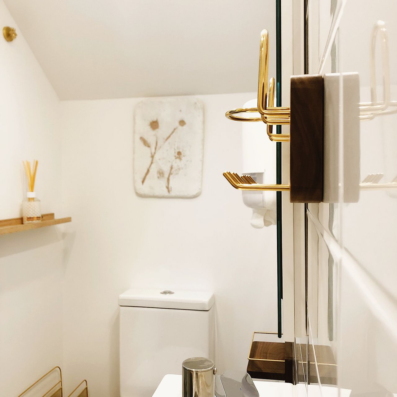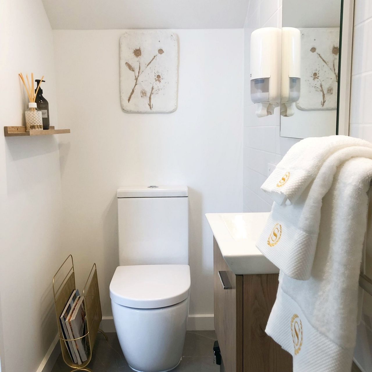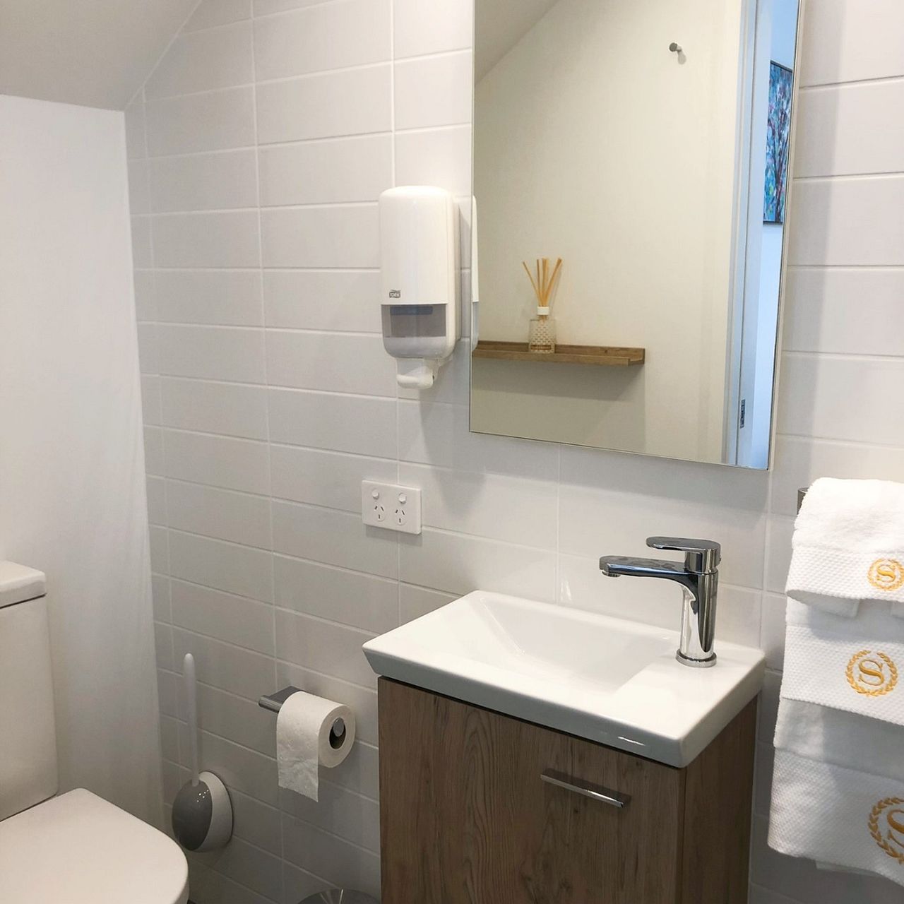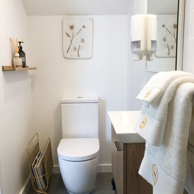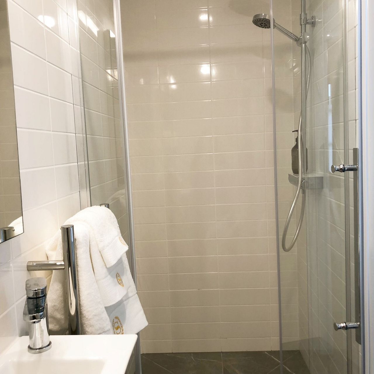 • Bamboo floors, panel heaters, carpeted bedroom, and tiled bathroom with rain shower