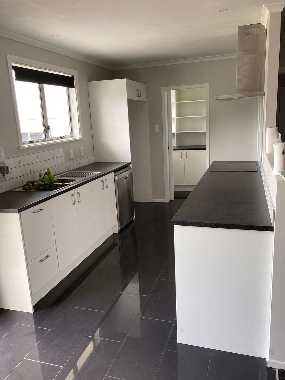 modern galley kitchen with butlers pantry.