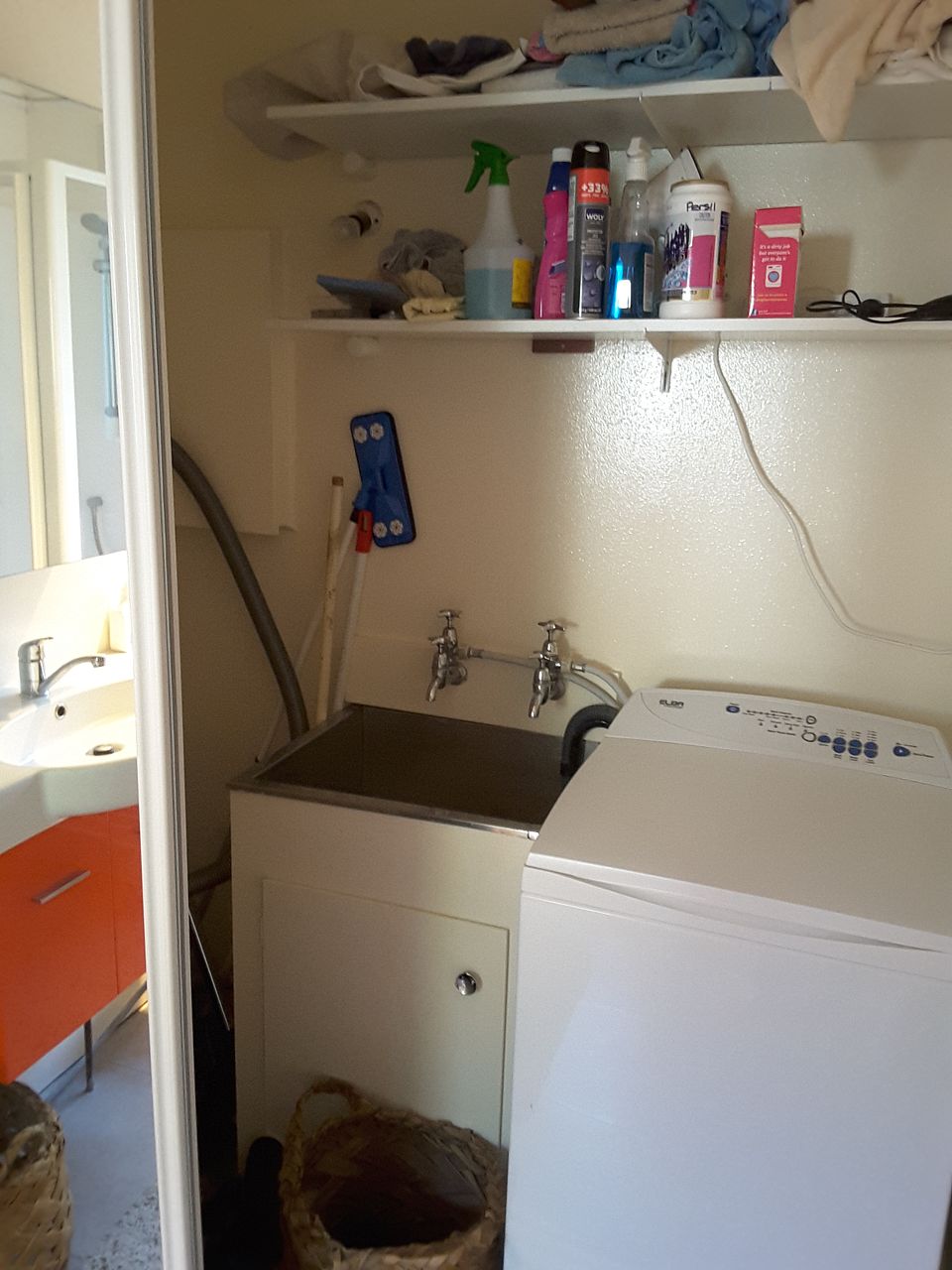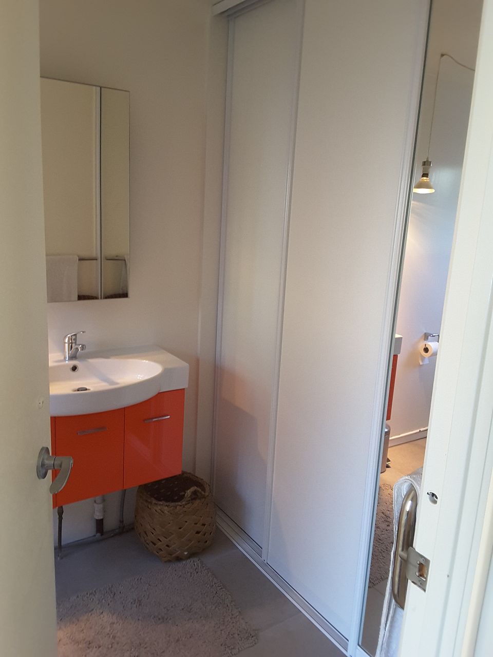 Laundry behind sliding doors in bathroom.