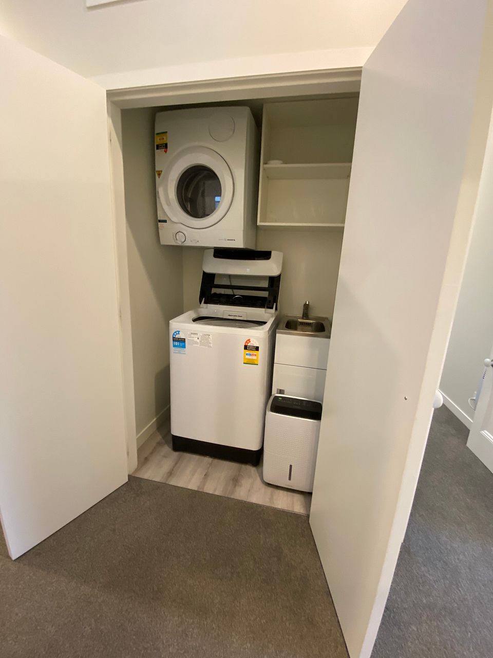 - Laundry with tub, washing machine, dryer & storage for linen