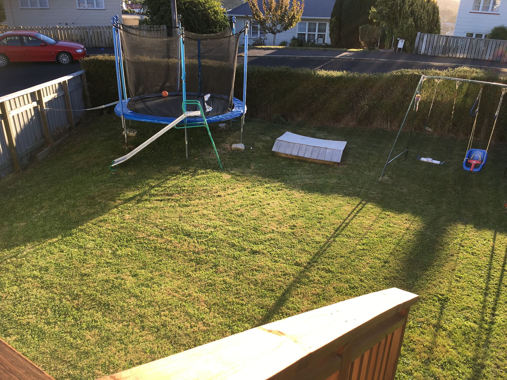 Small deck leading down to fenced area