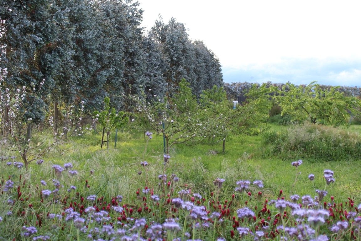 An orchard with at least 30 fruit trees and a large vegetable garden.