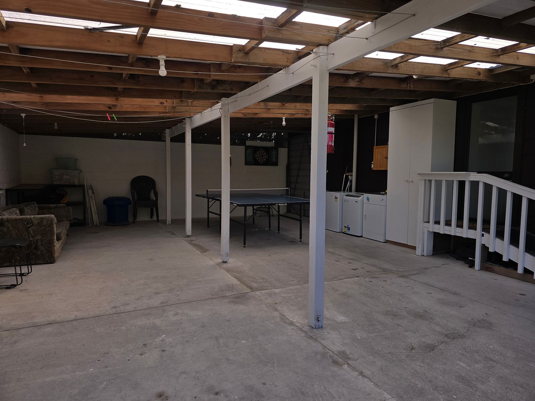 King bed in master and bunks in second room. Includes bbq, ping pong table, all crockery and cutlery, fridge x2, washing machine. Lovely outdoor dining. Plenty of parking. Safe neighborhood.